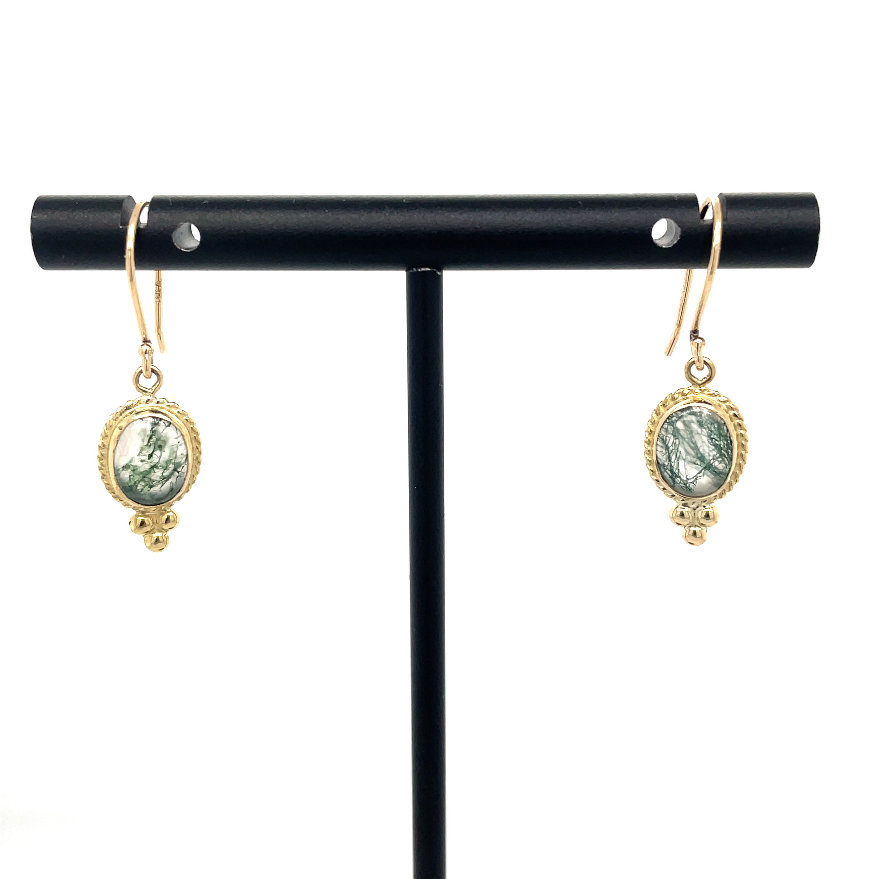 Product Description: 14KY Gold "Summerwind Collection" 8x6MM Moss Agate Cabochon Dangle Earrings