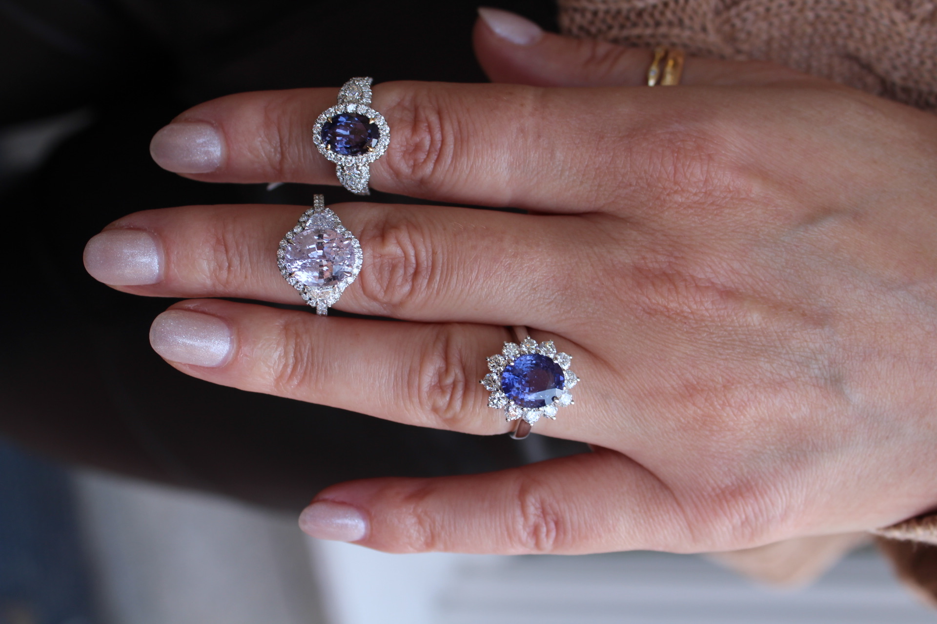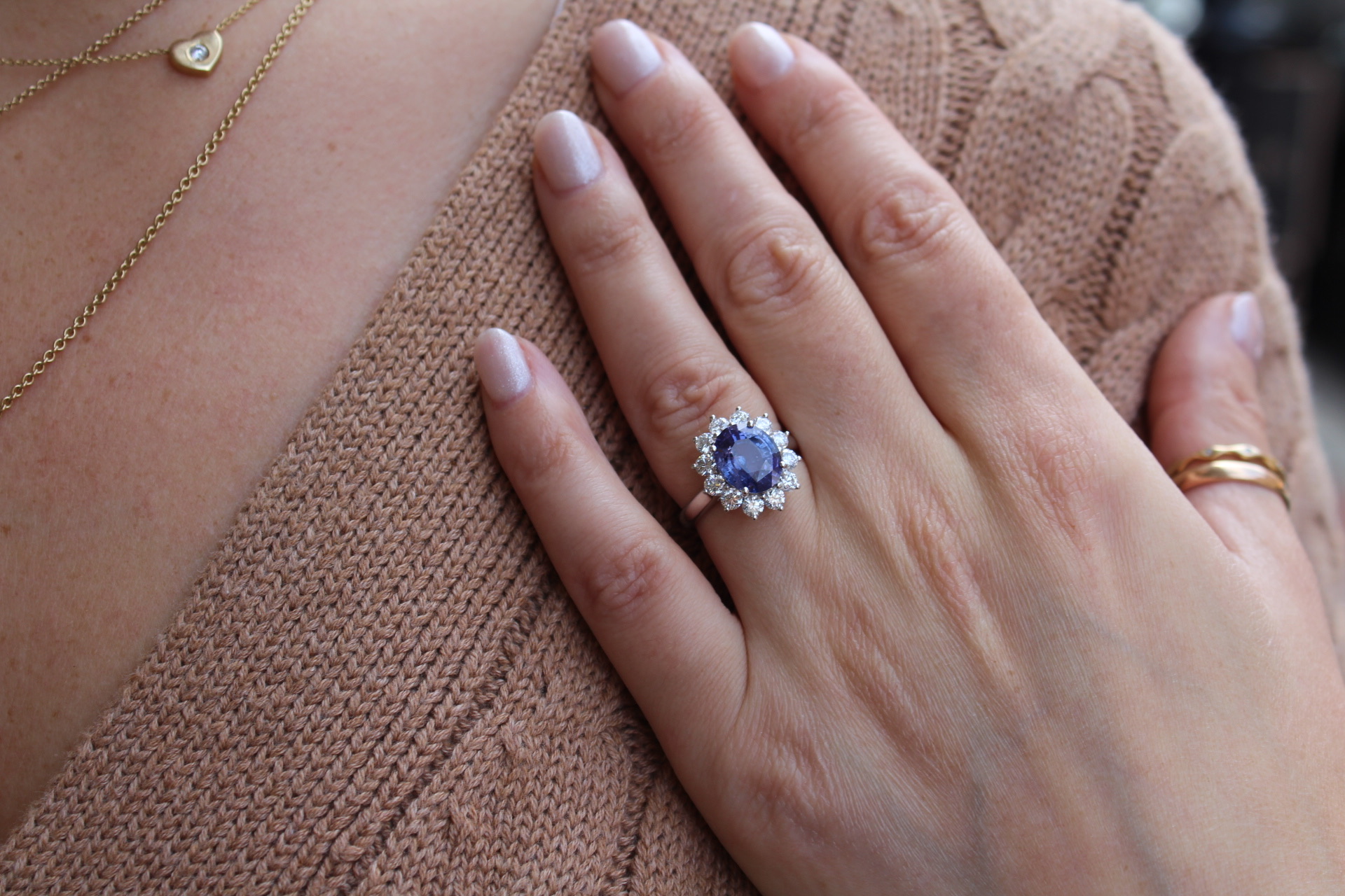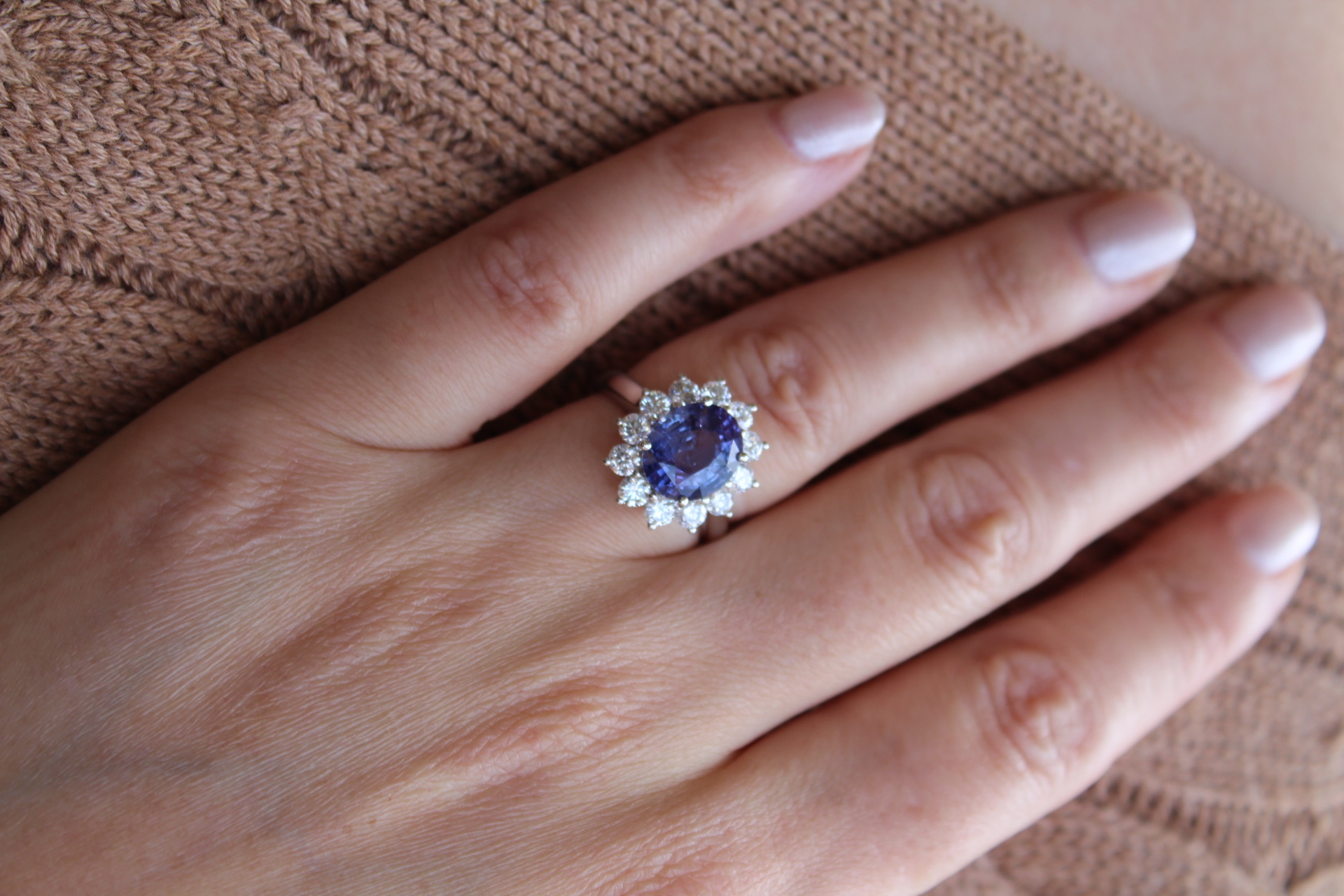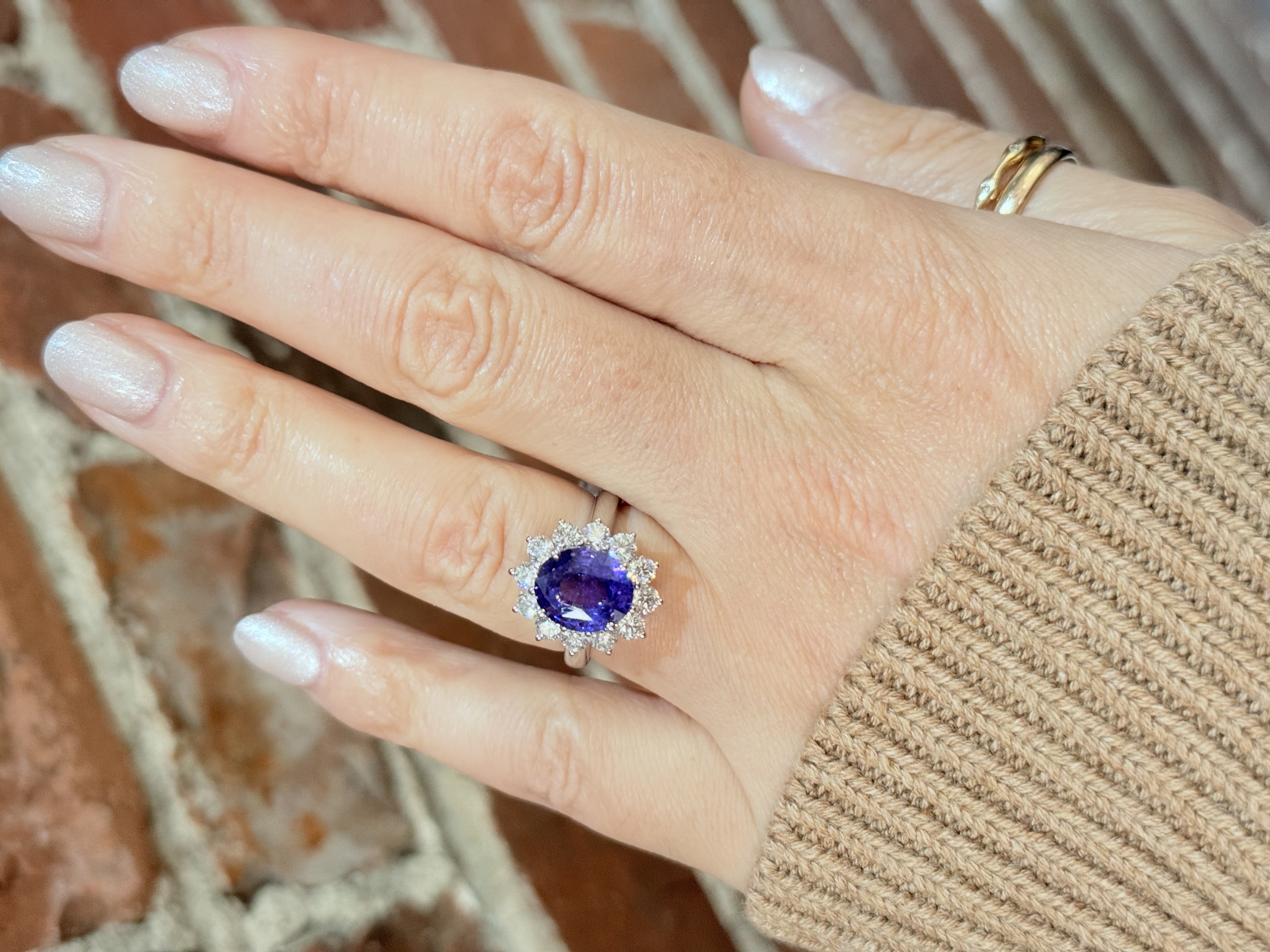 18KW GOLD OVAL PURPLE SAPPHIRE & DIAMOND HALO RING
