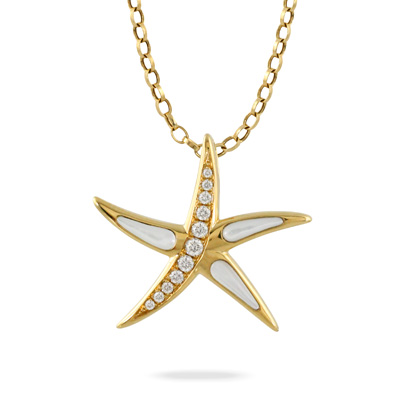 18k yellow gold diamond star fish pendant with clear quartz over white mother-of-pearl .17cttw G-H, SI