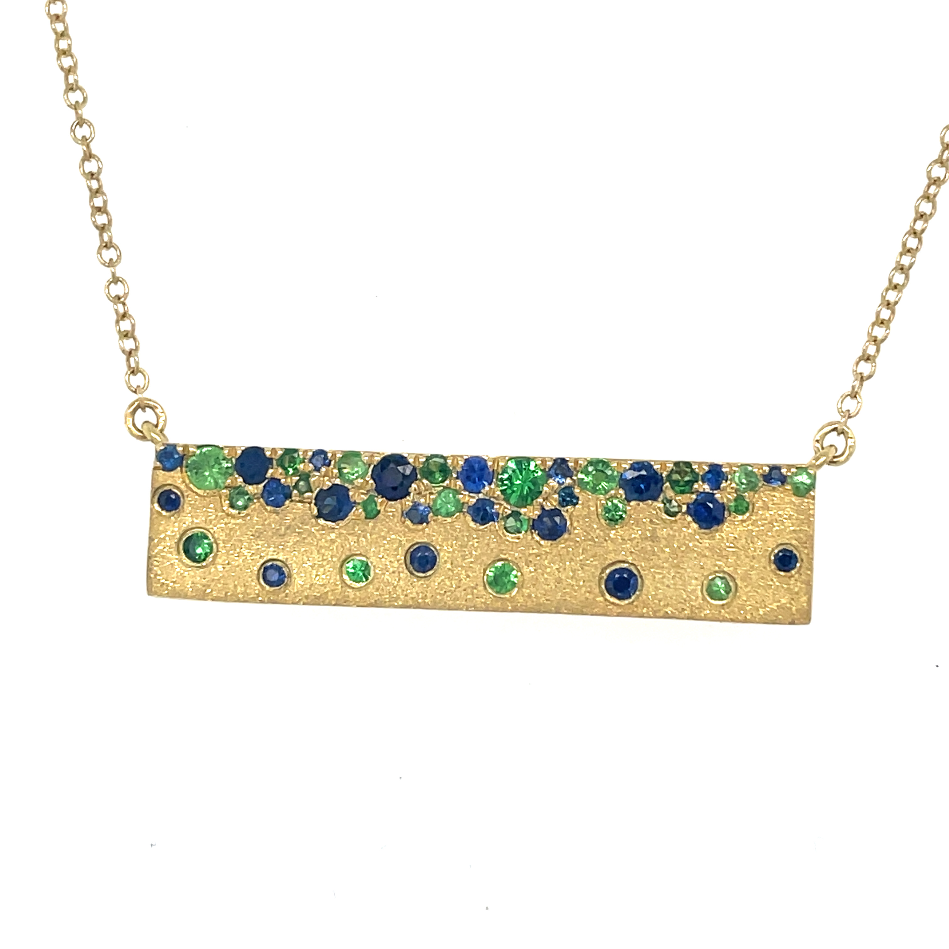 The "Confetti Collection" is a stunning piece of jewelry that is sure to catch any eye. This beautiful necklace is made from 14KT yellow gold with a satin finish, which gives it a luxurious look and feel. The necklace features a scattered bar design with flush-set round tsavorite garnet and blue sapphire stones that make it stand out from the rest.