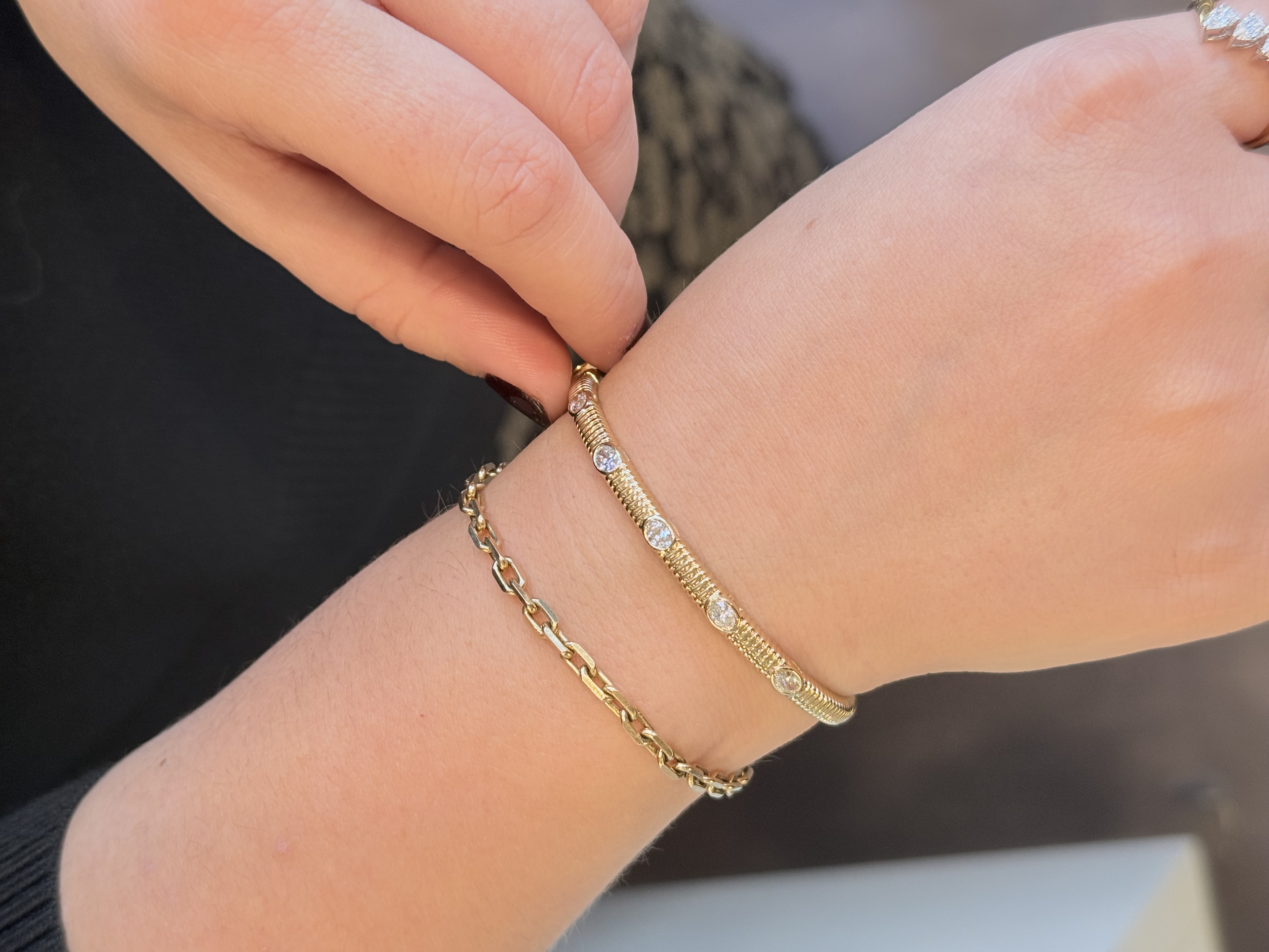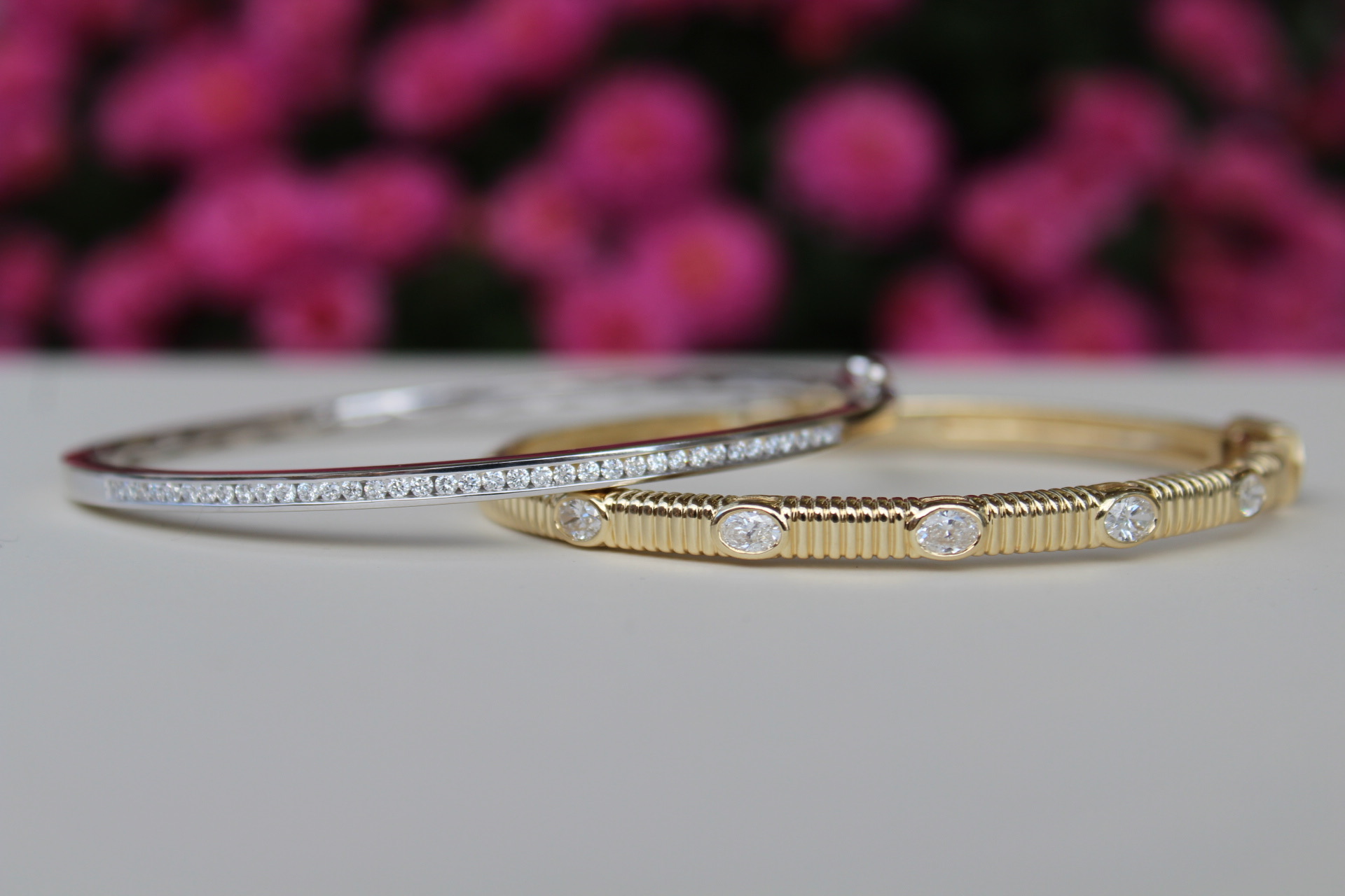 Description 14KY GOLD TEXTURED BANGLE BRACELET WITH BEZEL SET OVAL DIAMOND STATIONS 14KT YELLOW GOLD- 585, HIGH POLISH/TEXTURED5=.76CTTW OVAL BRILLIANT CUT DIAMONDS G-H COLOR, SI CLARITY, BEZEL SETHIDDEN BOX CLASP WITH SAFETY LATCH CLOSURE