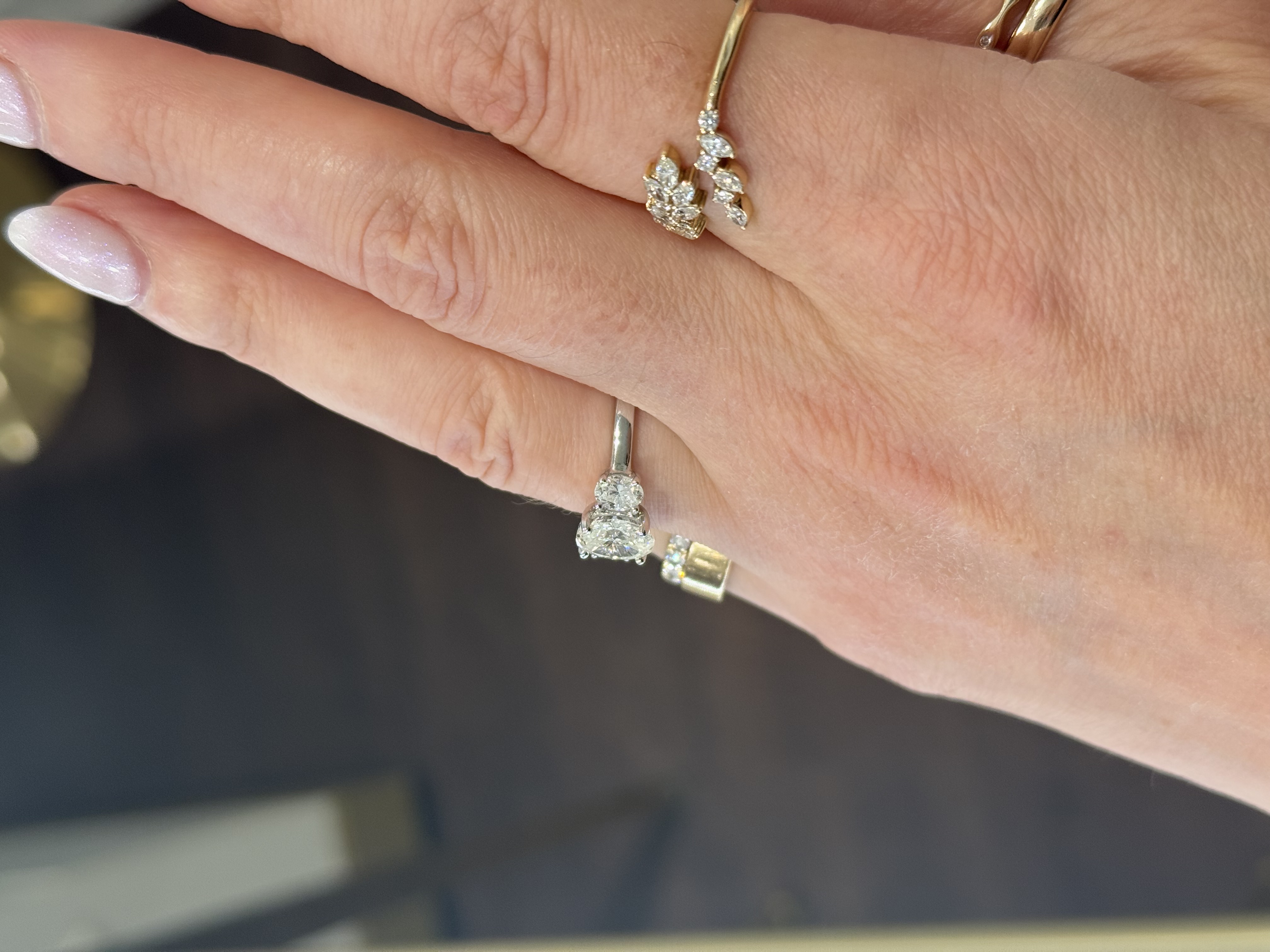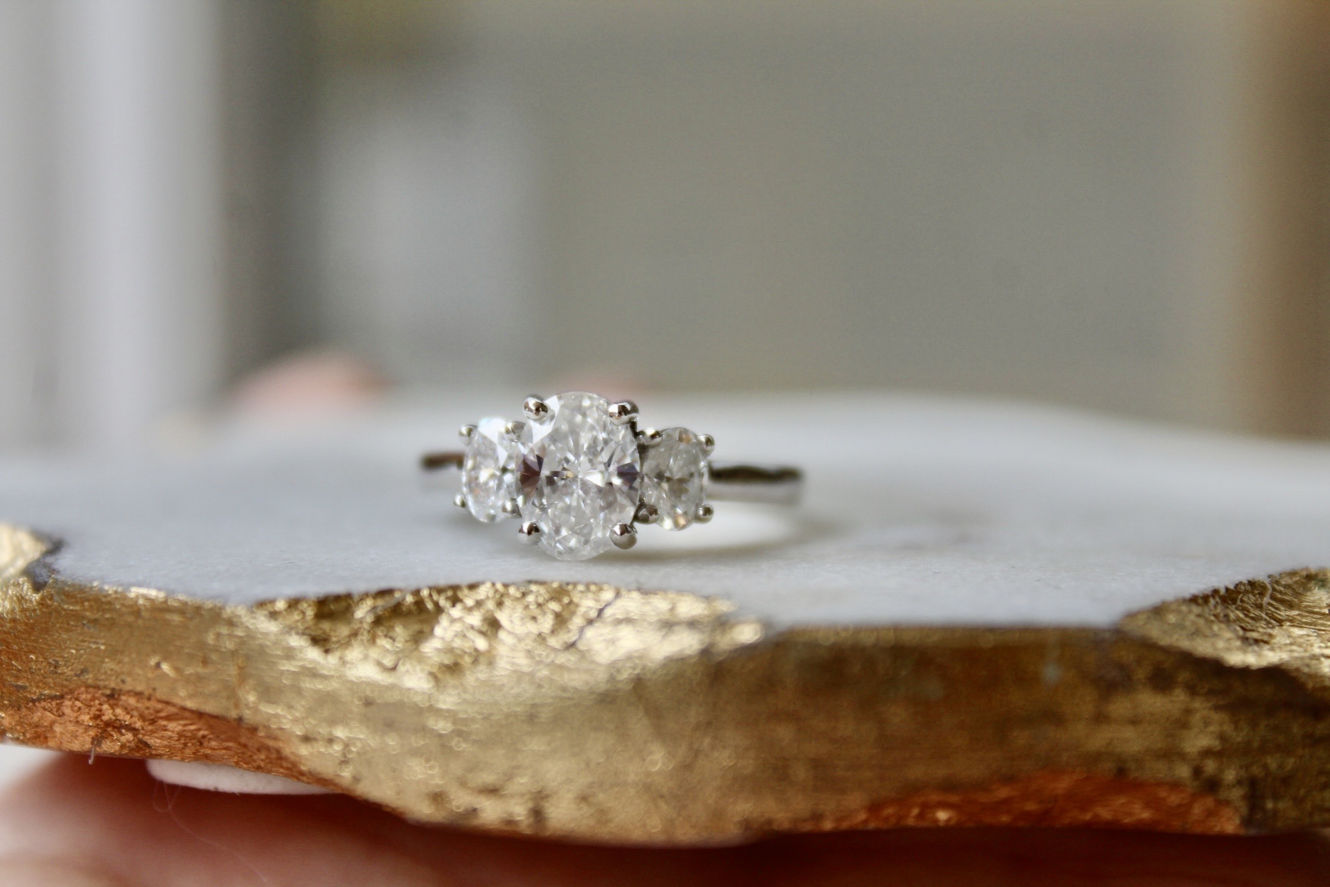 CUSTOM PLATINUM "SUMMERWIND COLLECTION" THREE-STONE DIAMOND ENGAGEMENT RING