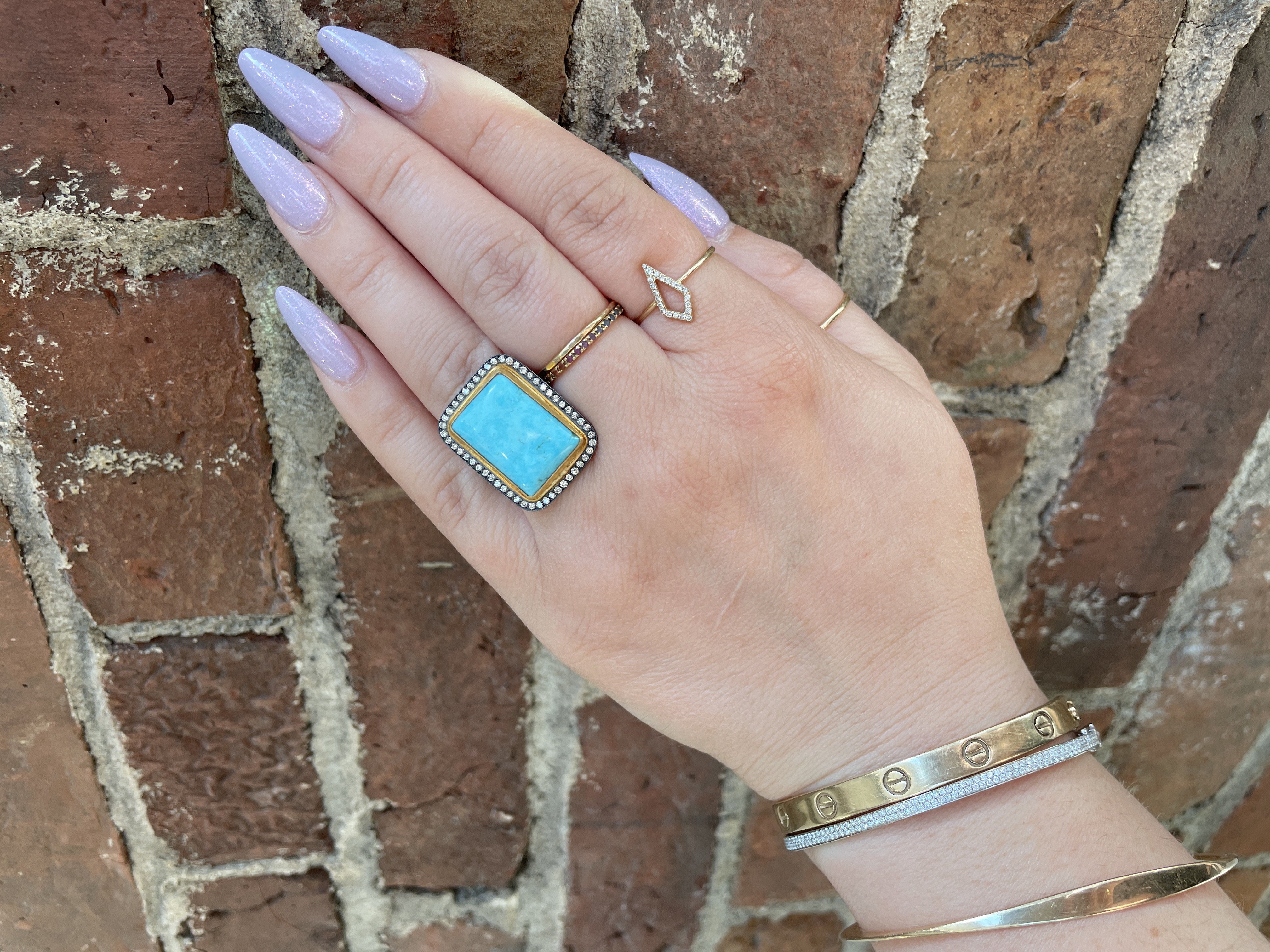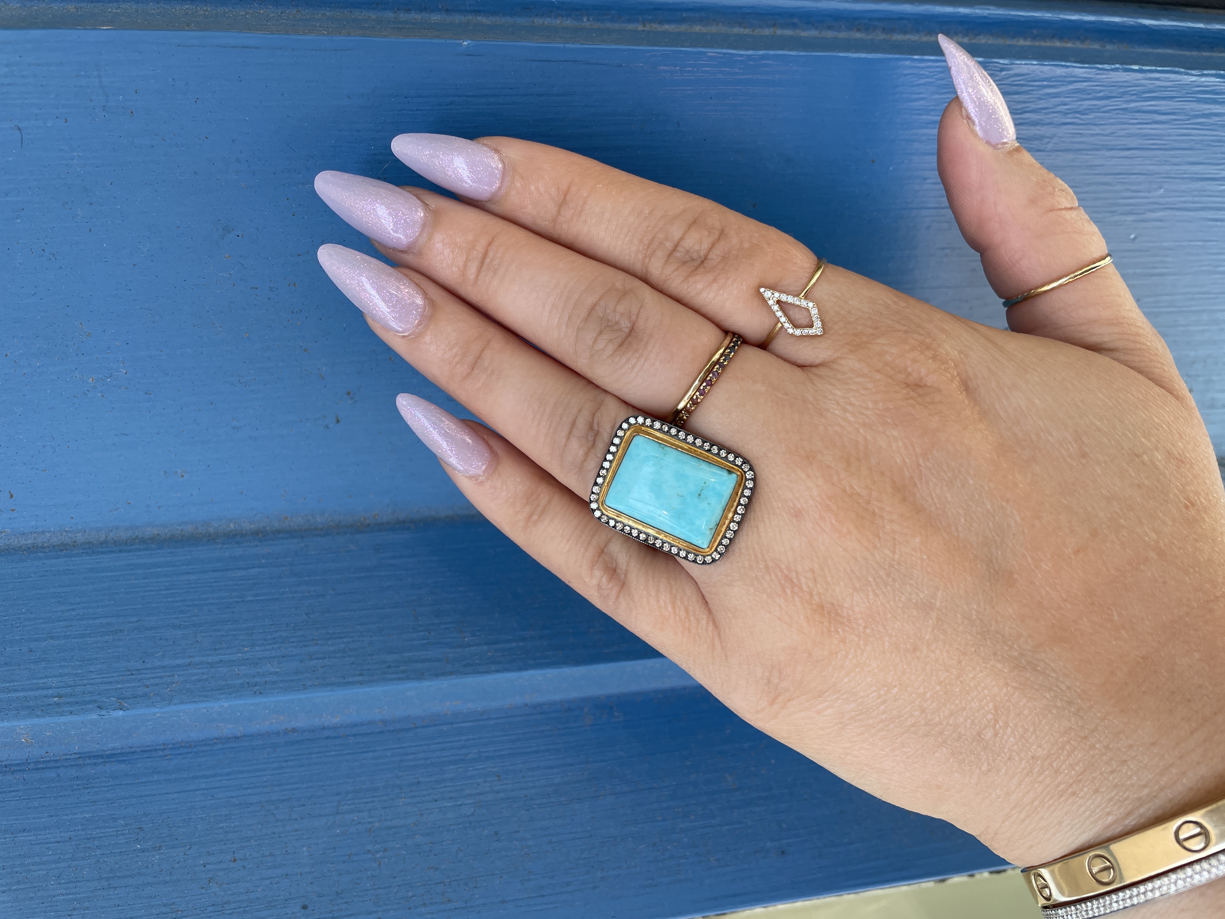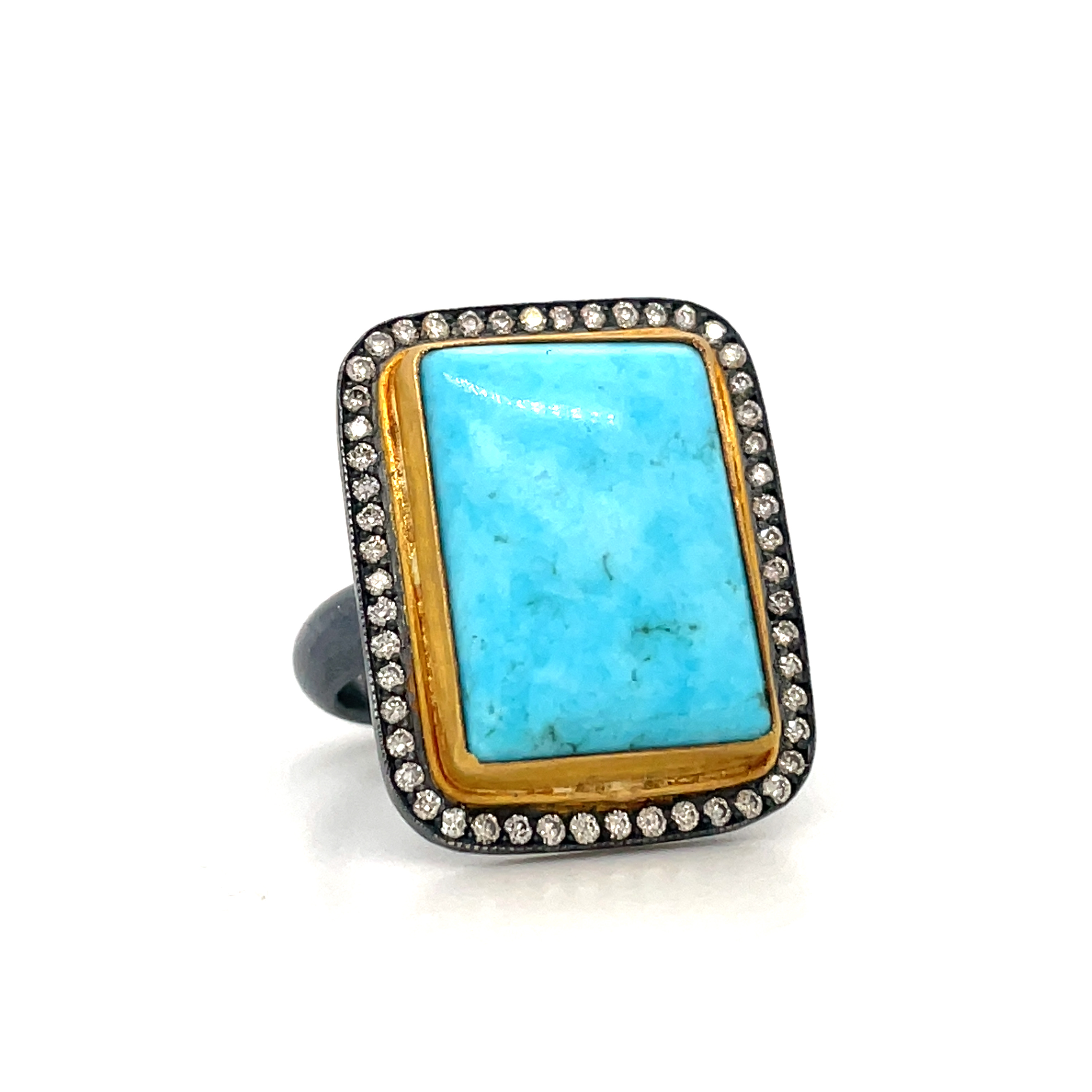 Surrounding the mesmerizing turquoise is a breathtaking halo of 52 round brilliant cut champagne diamonds, totaling .41 carats. These prong-set diamonds, nestled in oxidized sterling silver, create a stunning contrast that enhances the turquoise's natural beauty while adding a touch of celestial sparkle. The oxidized sterling silver detail and shank, also in a matte finish, provide a striking and elegant backdrop that complements the ring's overall aesthetic. This thoughtful design ensures that each element of the ring stands out while contributing to a cohesive and sophisticated look.