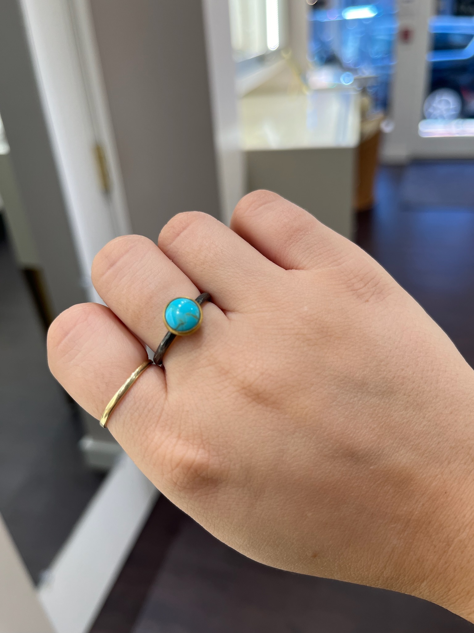 24KY GOLD & OXIDIZED STERLING SILVER "KATYA" BEZEL SET ROUND CABOCHON TURQUOISE RING FROM THE LIKA BEHAR COLLECTION