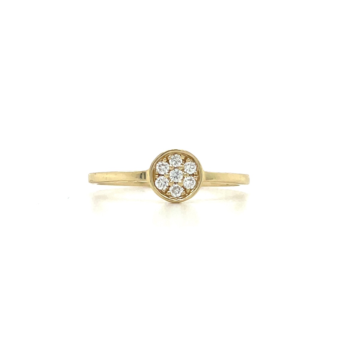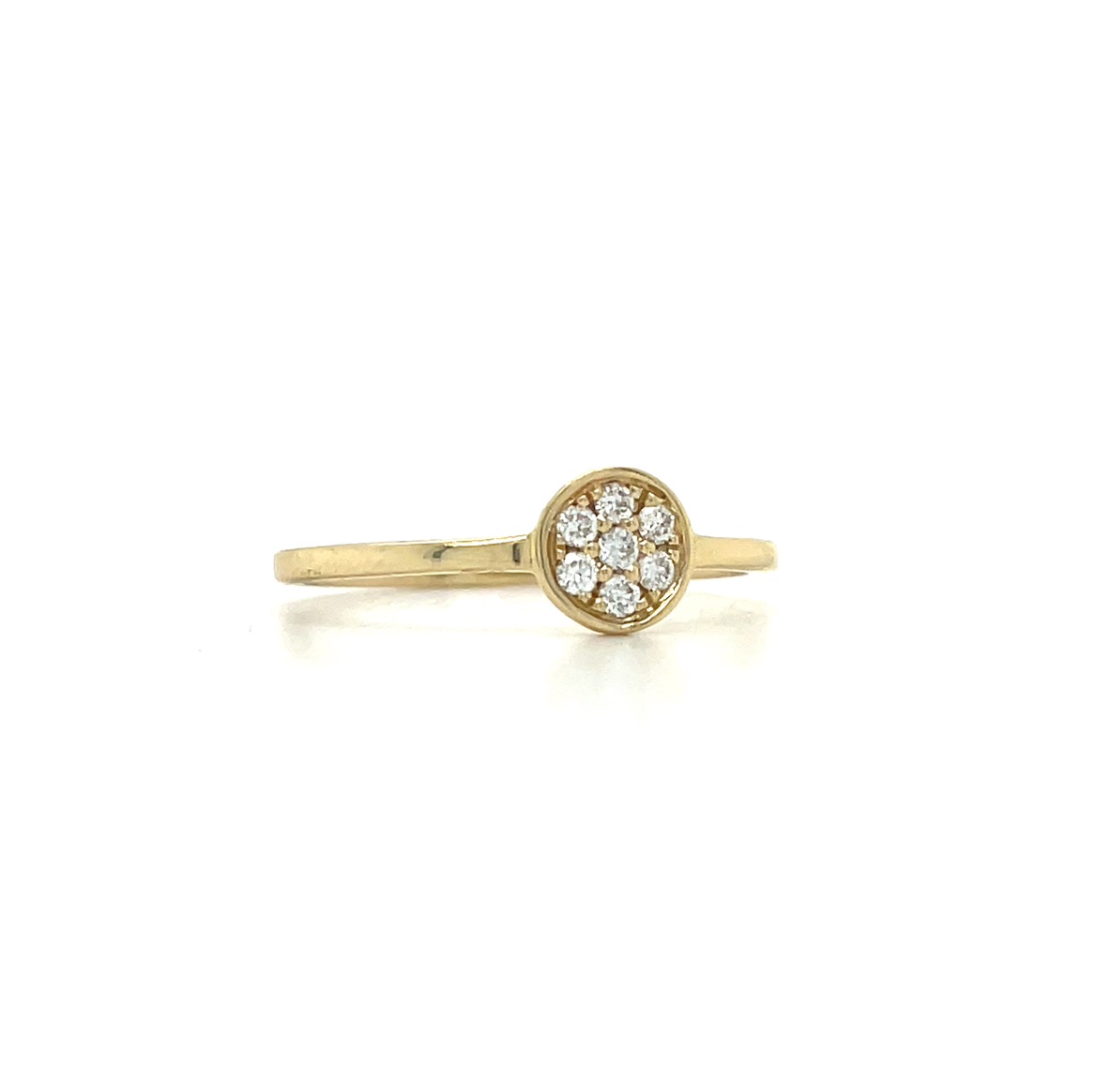 Description 14KY GOLD DIAMOND CIRCLE CLUSTER RING .11CTTW 14KT YELLOW GOLD- 585, HIGH POLISH7= .11CTTW ROUND BRILLIANT CUT DIAMONDS, G-H COLOR, SI CLARITY, PAVE SET WITH RIM FINGER SIZE 6.5