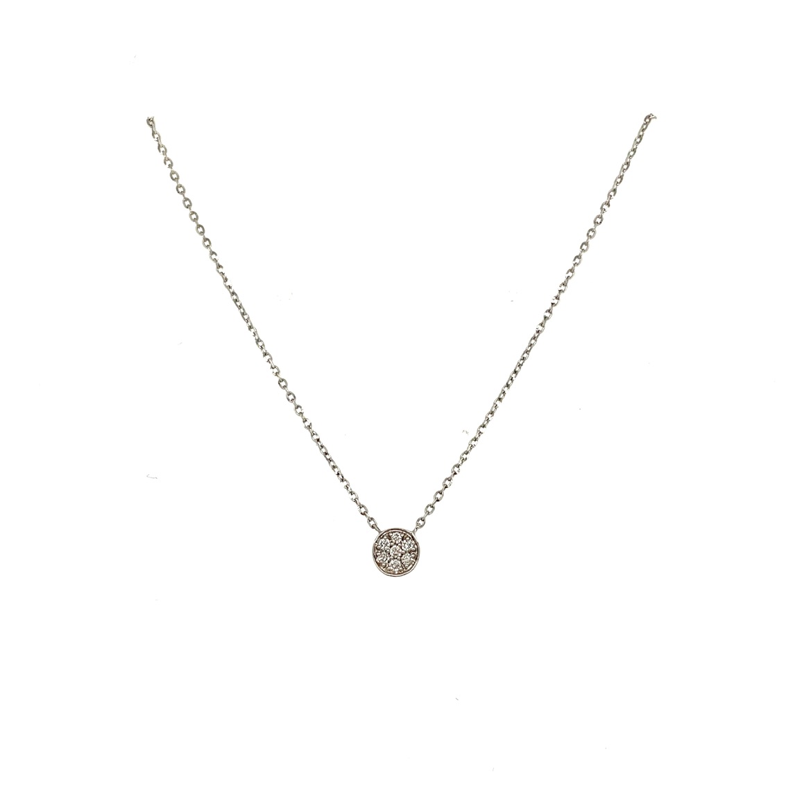 Description 14KW GOLD SMALL CIRCLE DIAMOND CLUSTER PENDANT ON 16-18" ADJUSTABLE 14KW GOLD DIAMOND CUT CABLE CHAIN14KT WHITE GOLD7=.07CTTW BEAD-SET ROUND BRILLIANT CUT DIAMONDS H-I, SI2-I118 INCH TOTAL LENGTH WITH JUMP RINGS AT 16 AND 17 INCHES