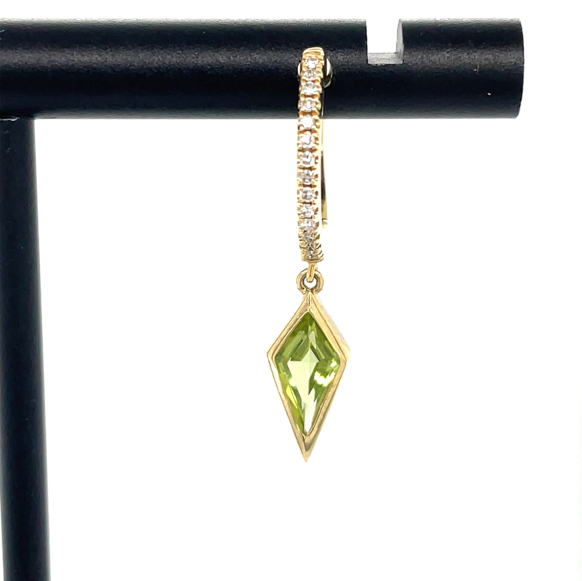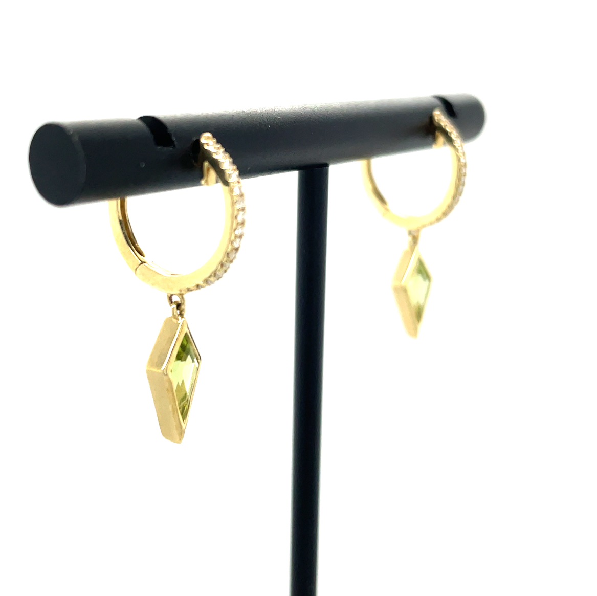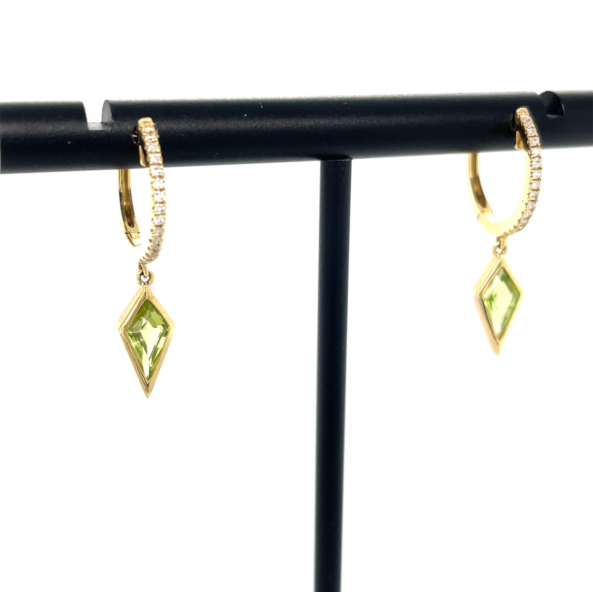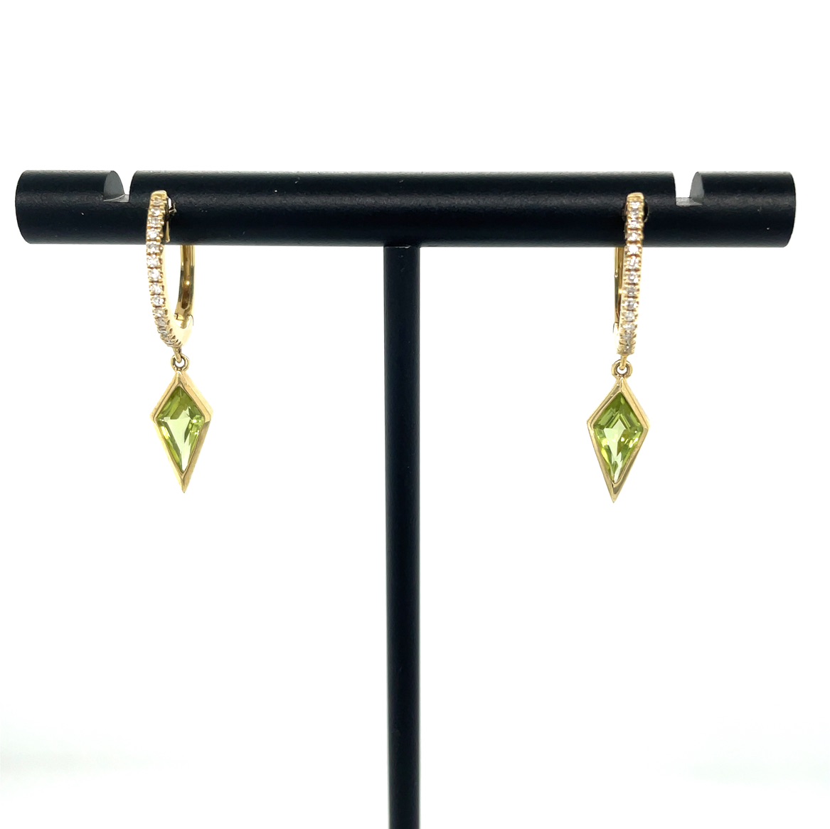 Peridot, often associated with prosperity and good fortune, has been treasured since ancient times. The Egyptians referred to it as the "gem of the sun," believing it to protect its wearer from the terrors of the night. The kite shape of the gemstones adds a modern twist to this storied gem, symbolizing freedom and aspiration. These earrings are inspired by the elegance of the Art Deco era, where geometric shapes and bold designs reigned supreme. With their dazzling diamond accents, these earrings encapsulate a blend of history, beauty, and innovation, making them a must-have for those who appreciate both tradition and contemporary style.