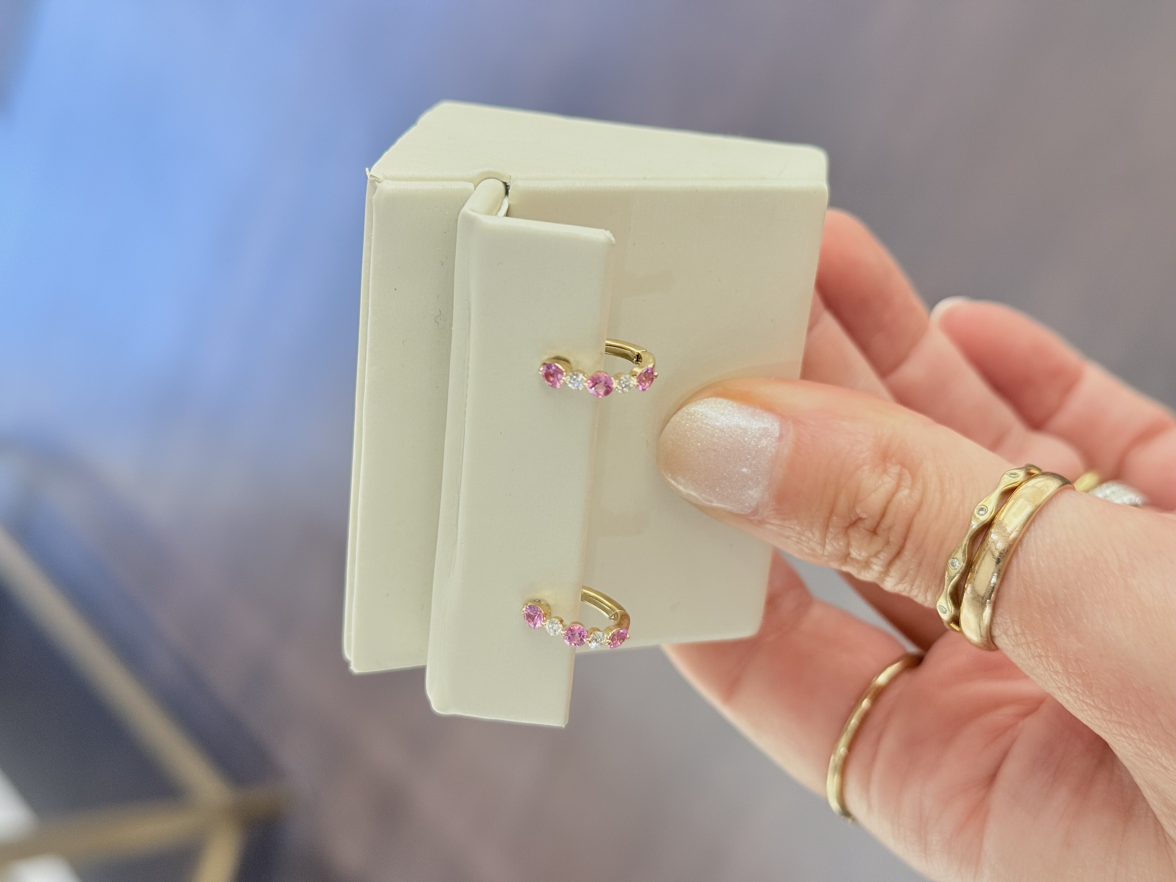 14KY GOLD ALTERNATING PINK SAPPHIRE & DIAMOND HUGGIE HOOP EARRINGS