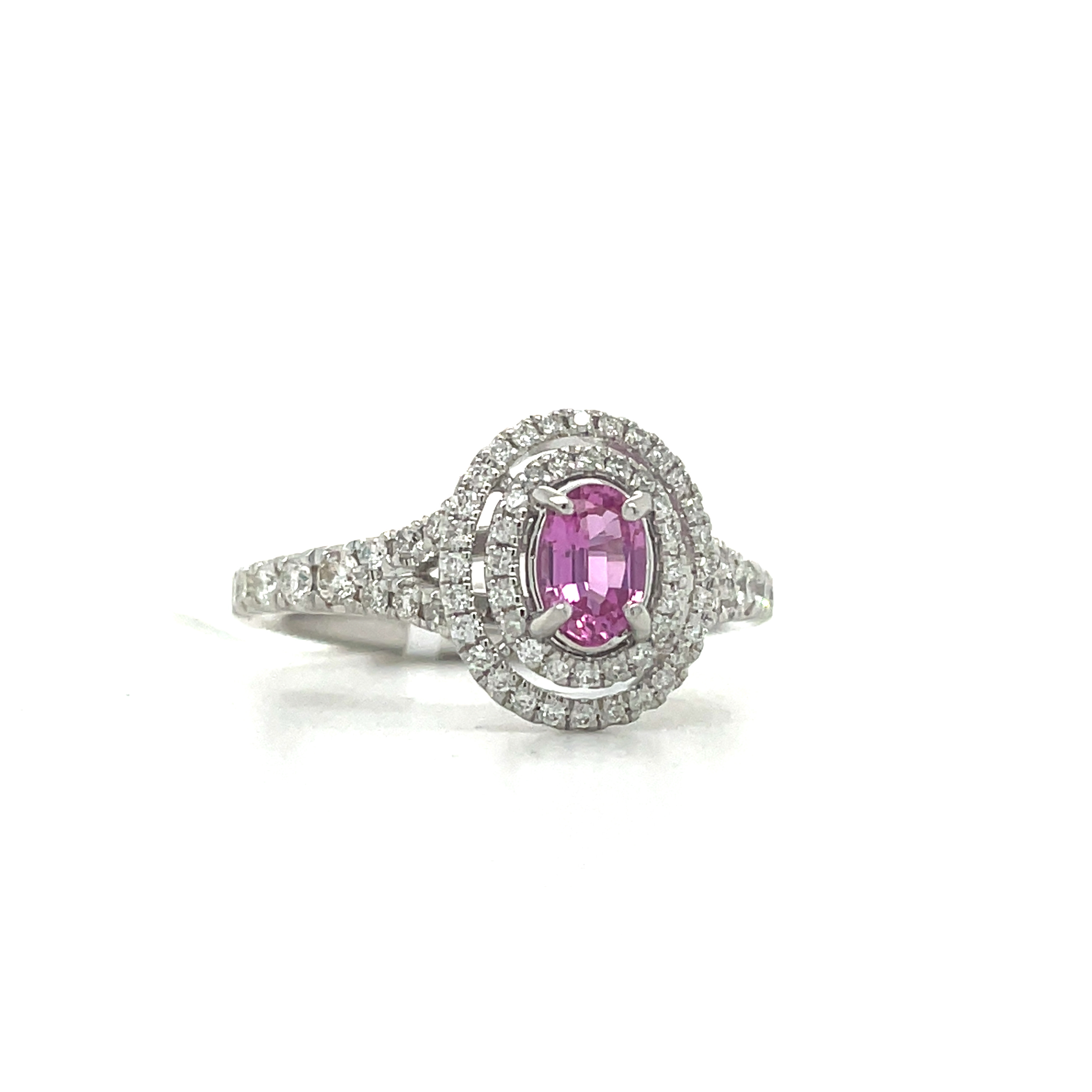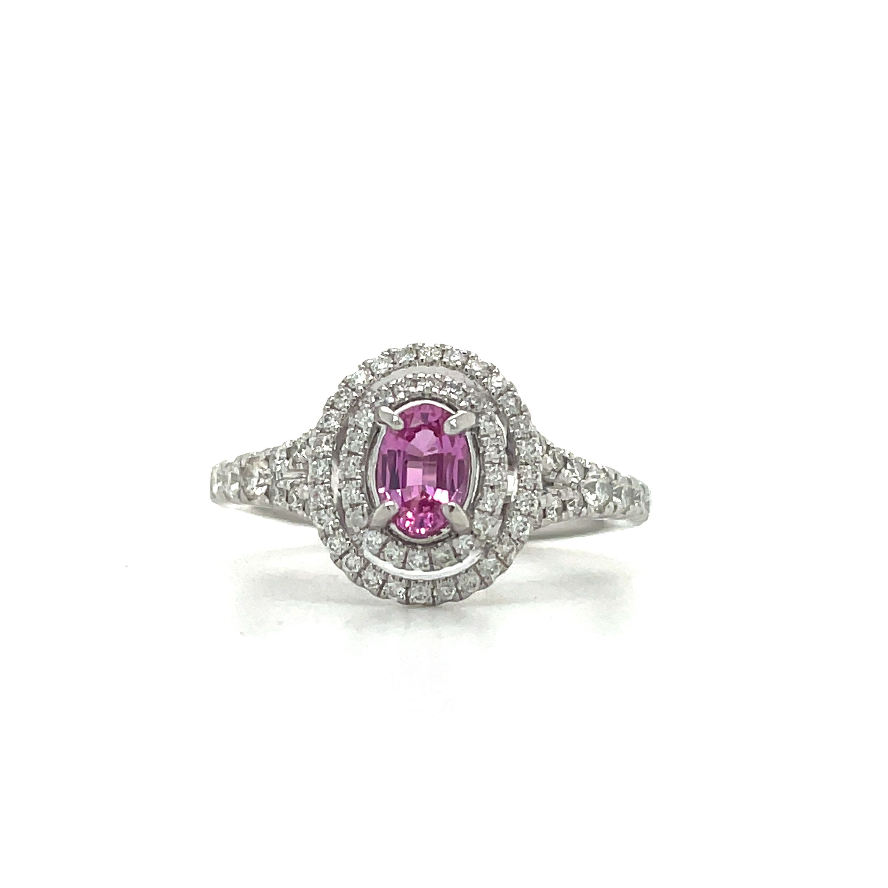 PLATINUM OVAL PINK SAPPHIRE & DOUBLE DIAMOND HALO RING WITH DIAMOND ACCENTED SPLIT SHANK