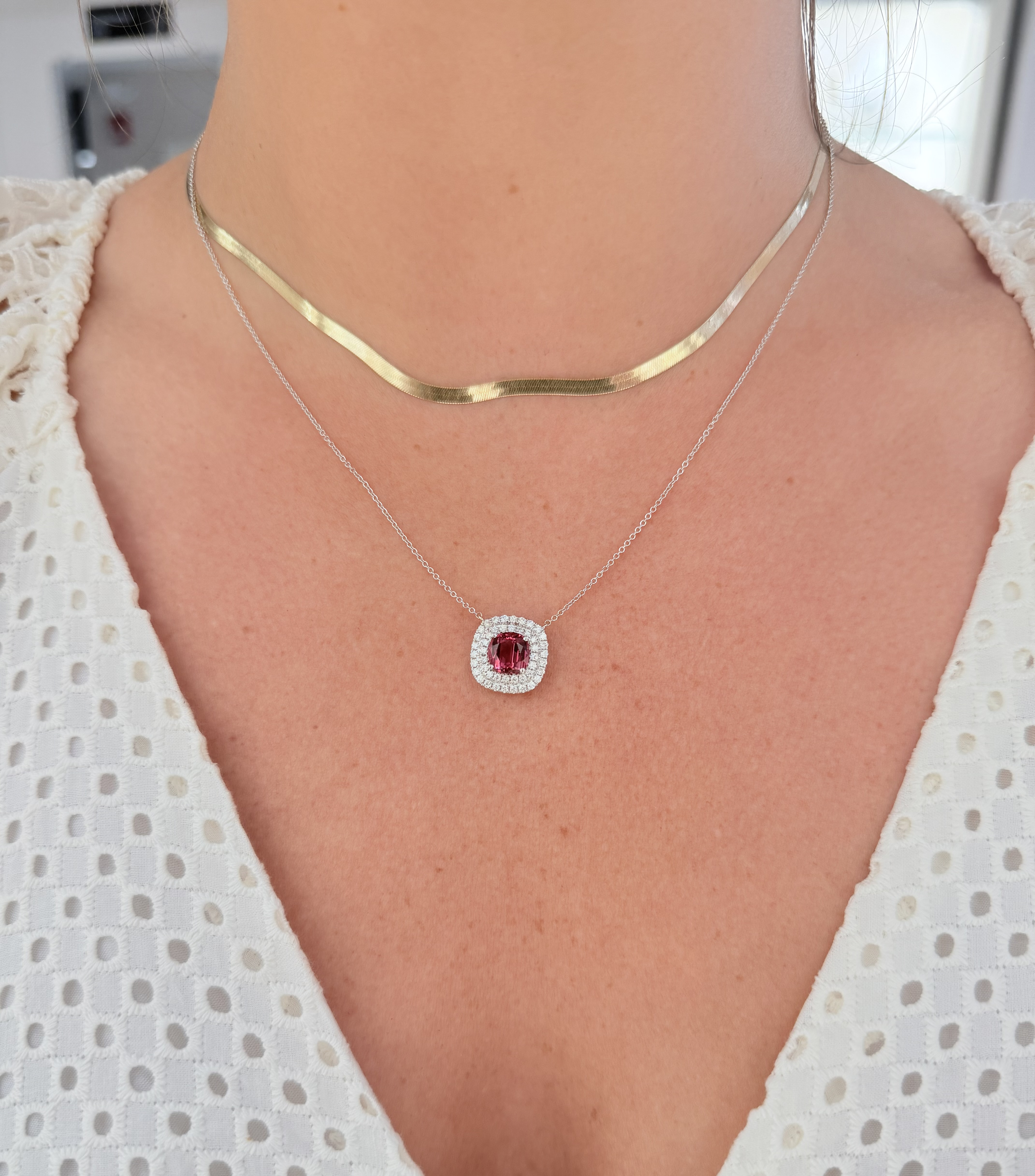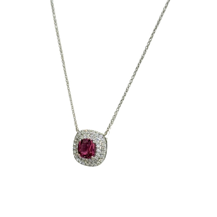18KW GOLD CUSHION CUT PINK TOURMALINE & DOUBLE DIAMOND HALO PENDANT
