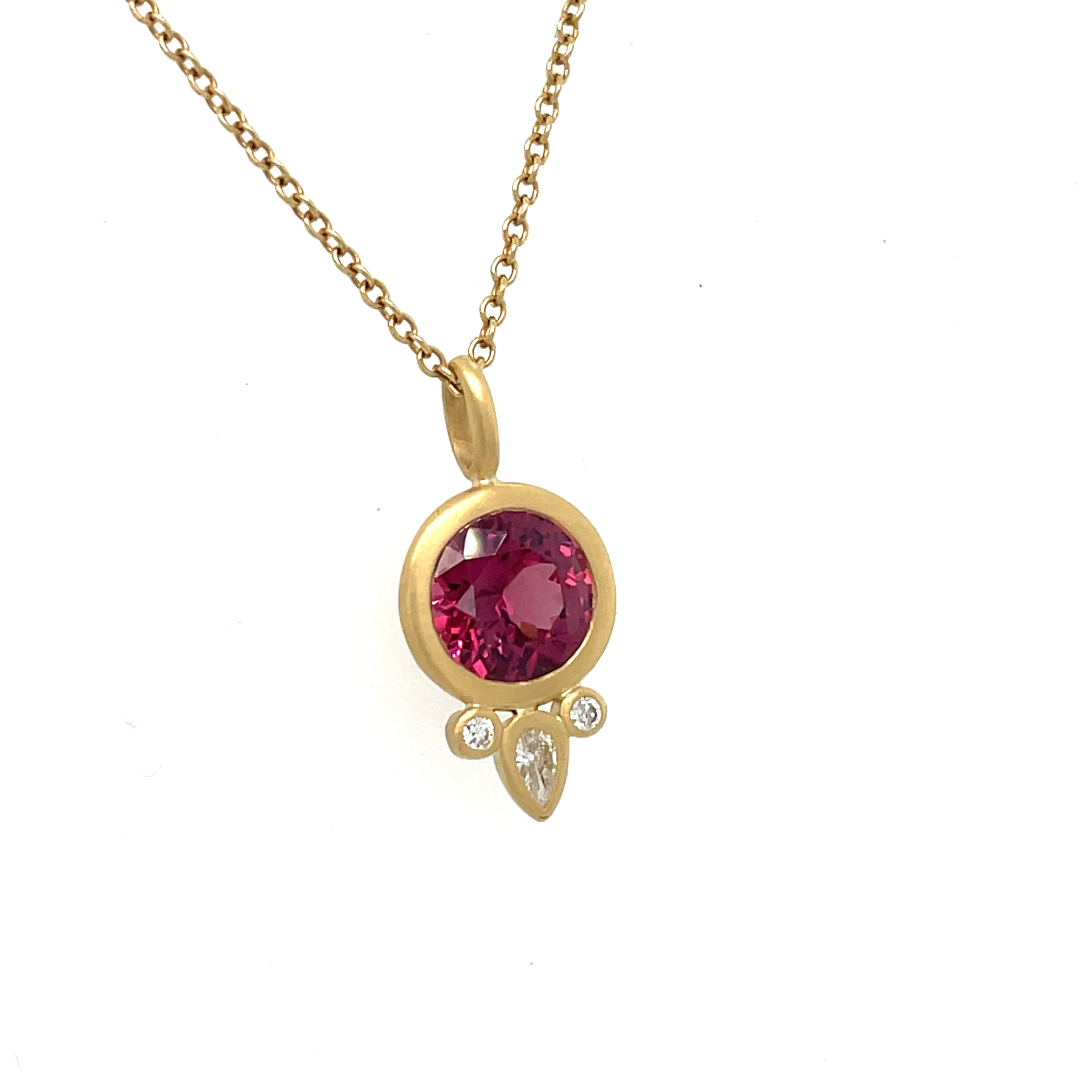 Adding to the pendant's allure are three dazzling diamonds, meticulously selected and set to enhance the overall brilliance of the piece. The round brilliant and pear-shaped diamonds are also bezel-set with a satin finish, seamlessly complementing the garnet and adding a touch of sparkle. The design is further elevated by an open undercarriage, allowing more light to pass through and magnify the brilliance of both the garnet and diamonds. The attached bail ensures that the pendant hangs gracefully, making it a perfect match for any chain of your choice.