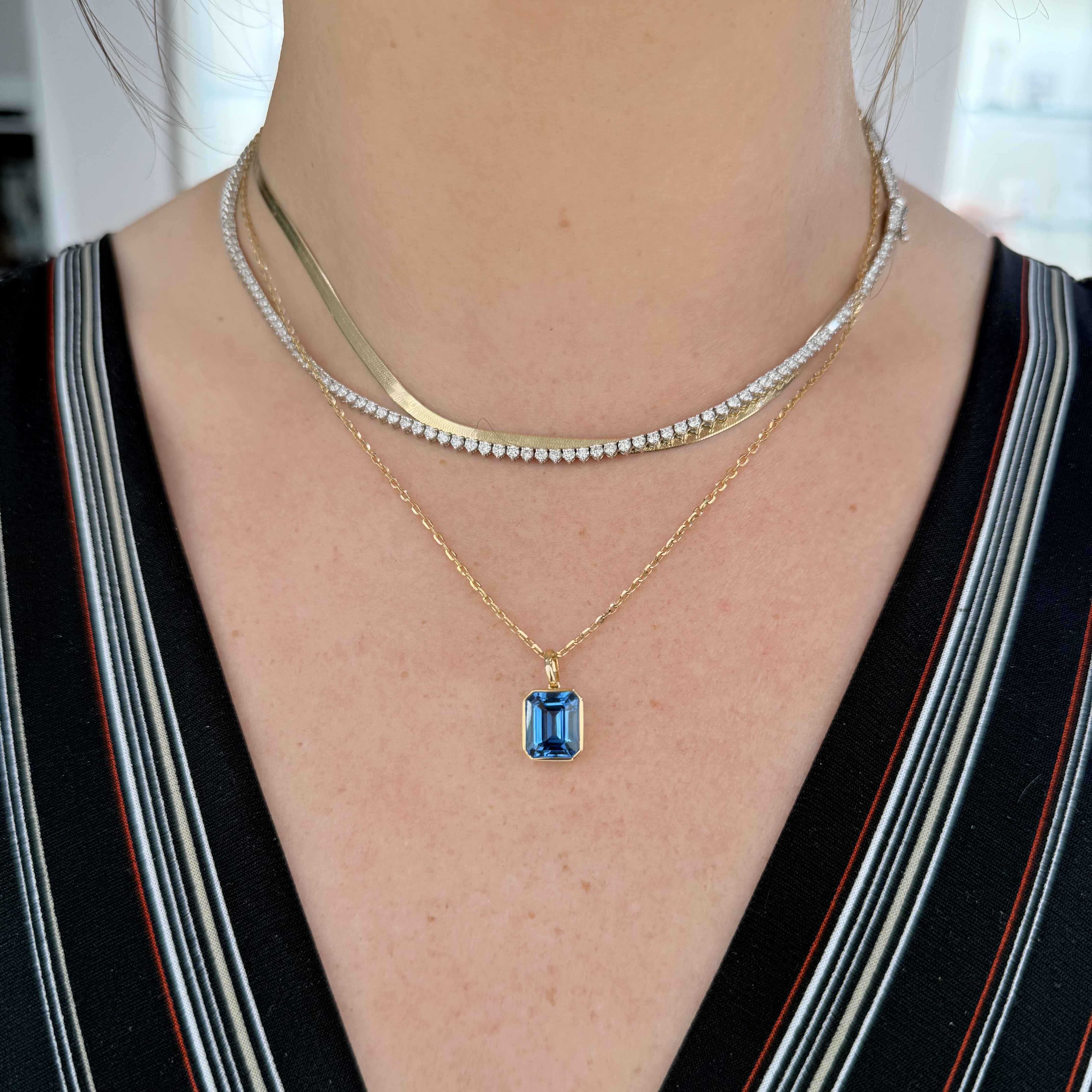 Description 18KY GOLD BEZEL-SET EMERALD CUT LONDON BLUE TOPAZ PENDANT 18KT YELLOW GOLD- 750, HIGH POLISH1=3.98CT EMERALD CUT LONDON BLUE TOPAZ, BEZEL SETPOLISHED OVAL BAIL *chain sold separately. shown on an 18" cable chain