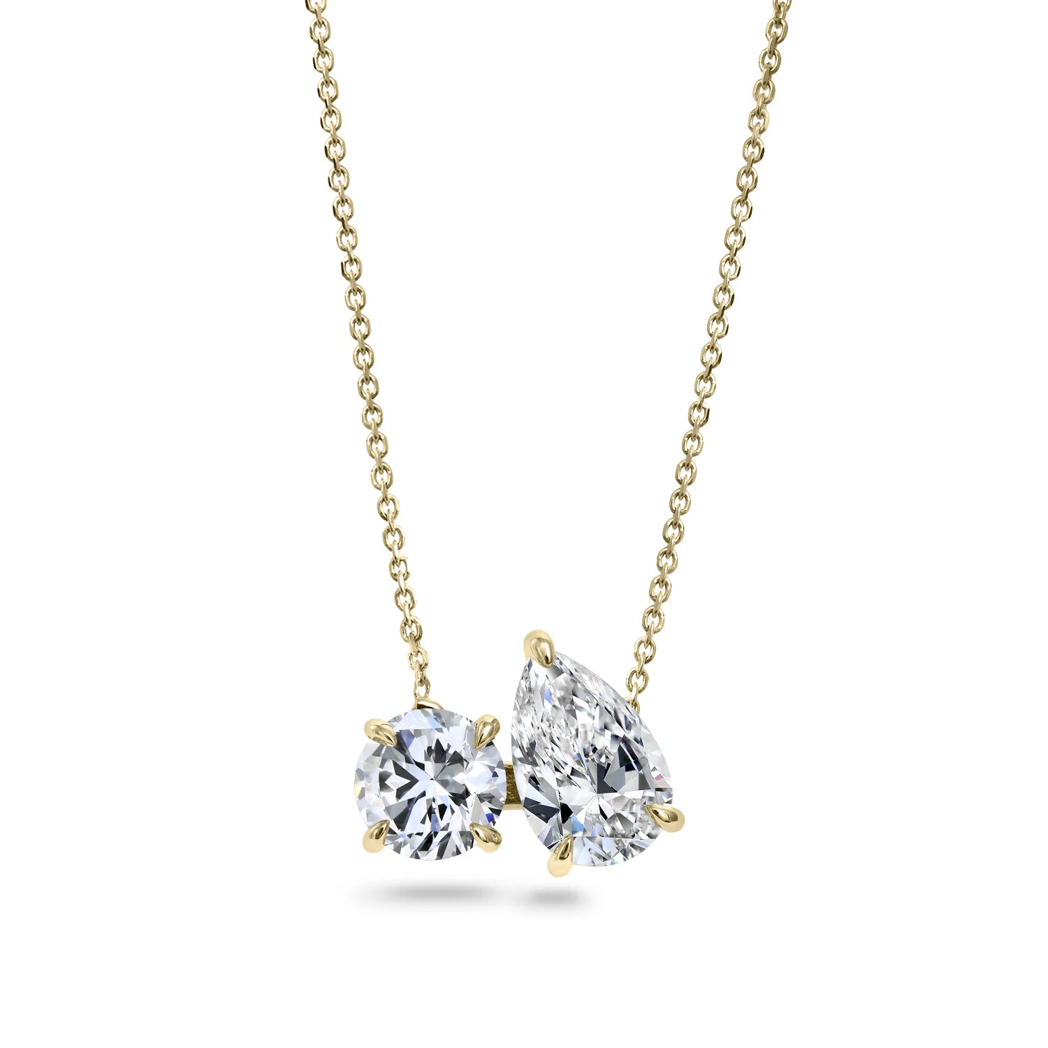 Designed to celebrate love shared between two people, the Clarity Diamond™ Round and Pear Diamond Toi et Moi Pendant showcases two brilliant GIA graded diamonds (2.50ctw). A beautiful way to commemorate love, this stylish piece features a 1.5ct pear diamond and a 1ct round diamond.