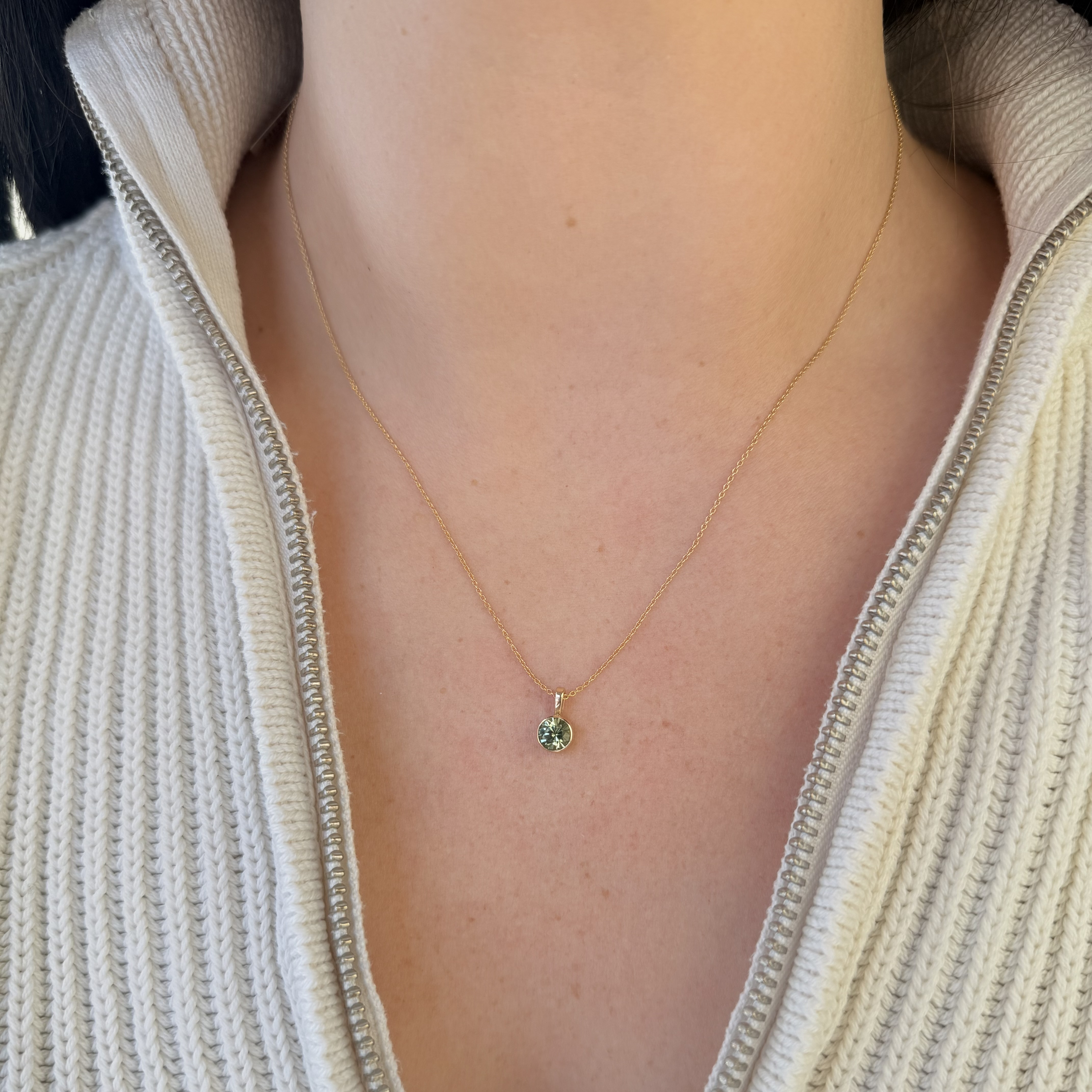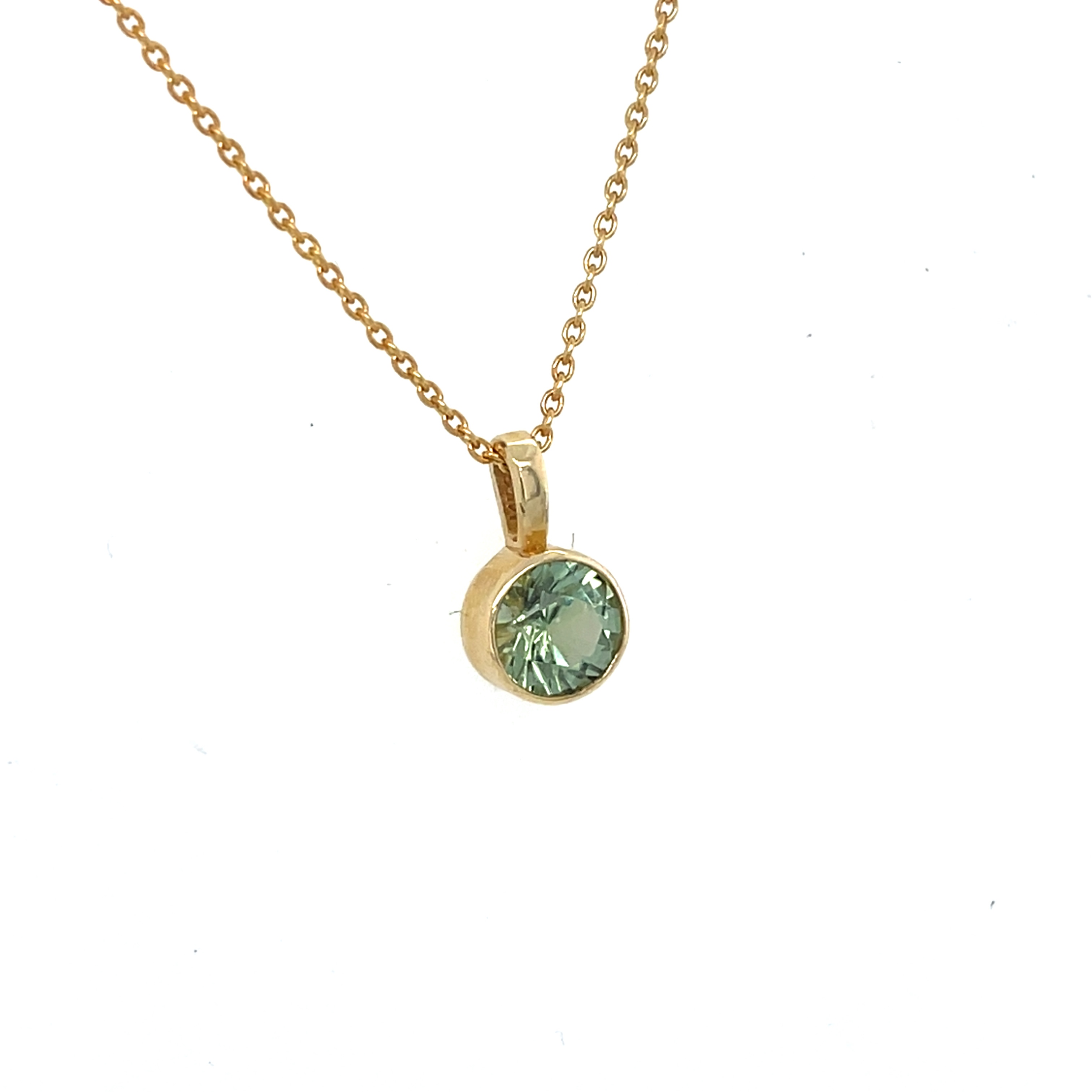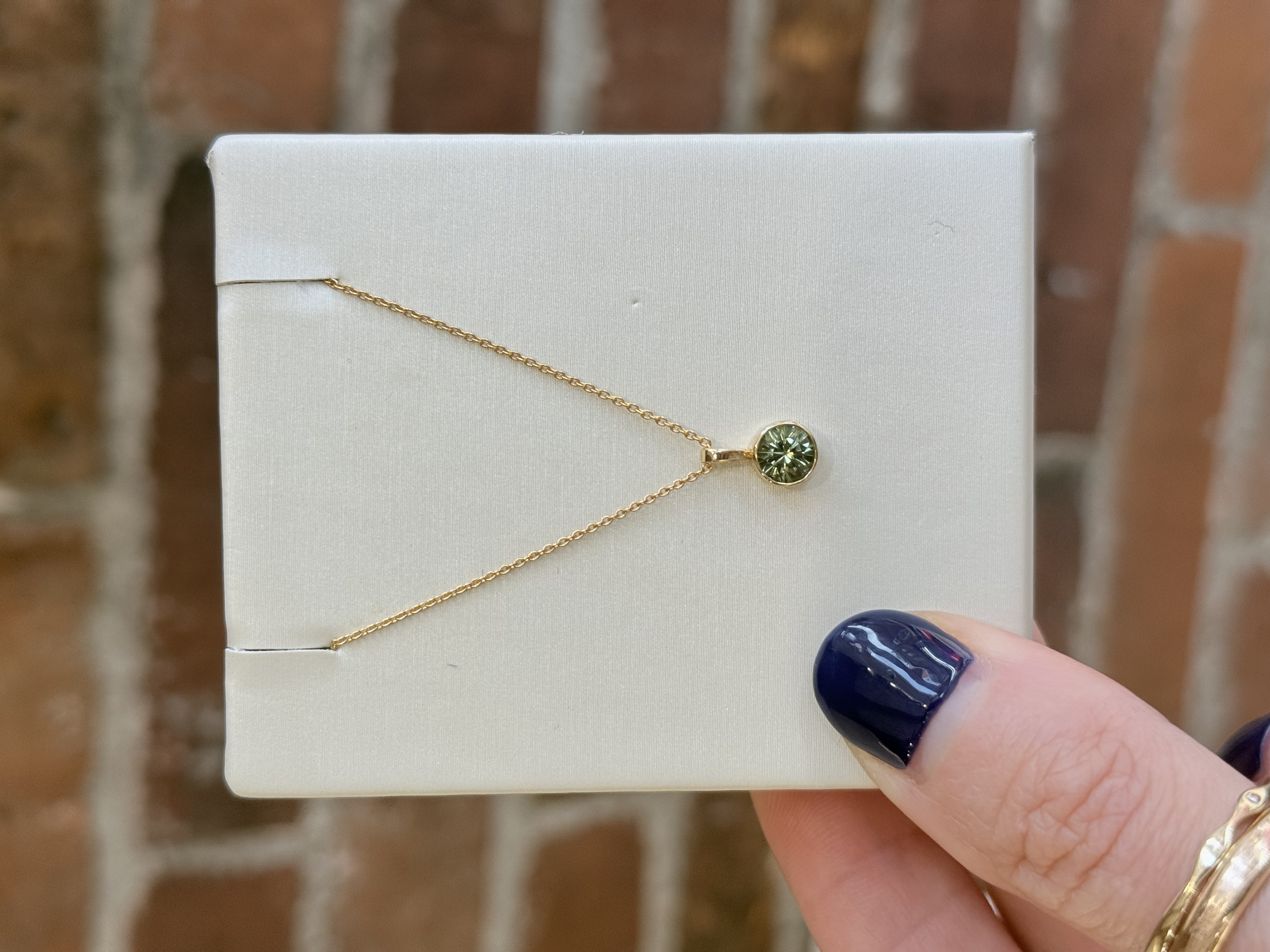 14KY GOLD "SUMMERWIND COLLECTION: JUICY GEMS" BEZEL SET ROUND YELLOWISH-GREEN MAINE TOURMALINE PENDANT