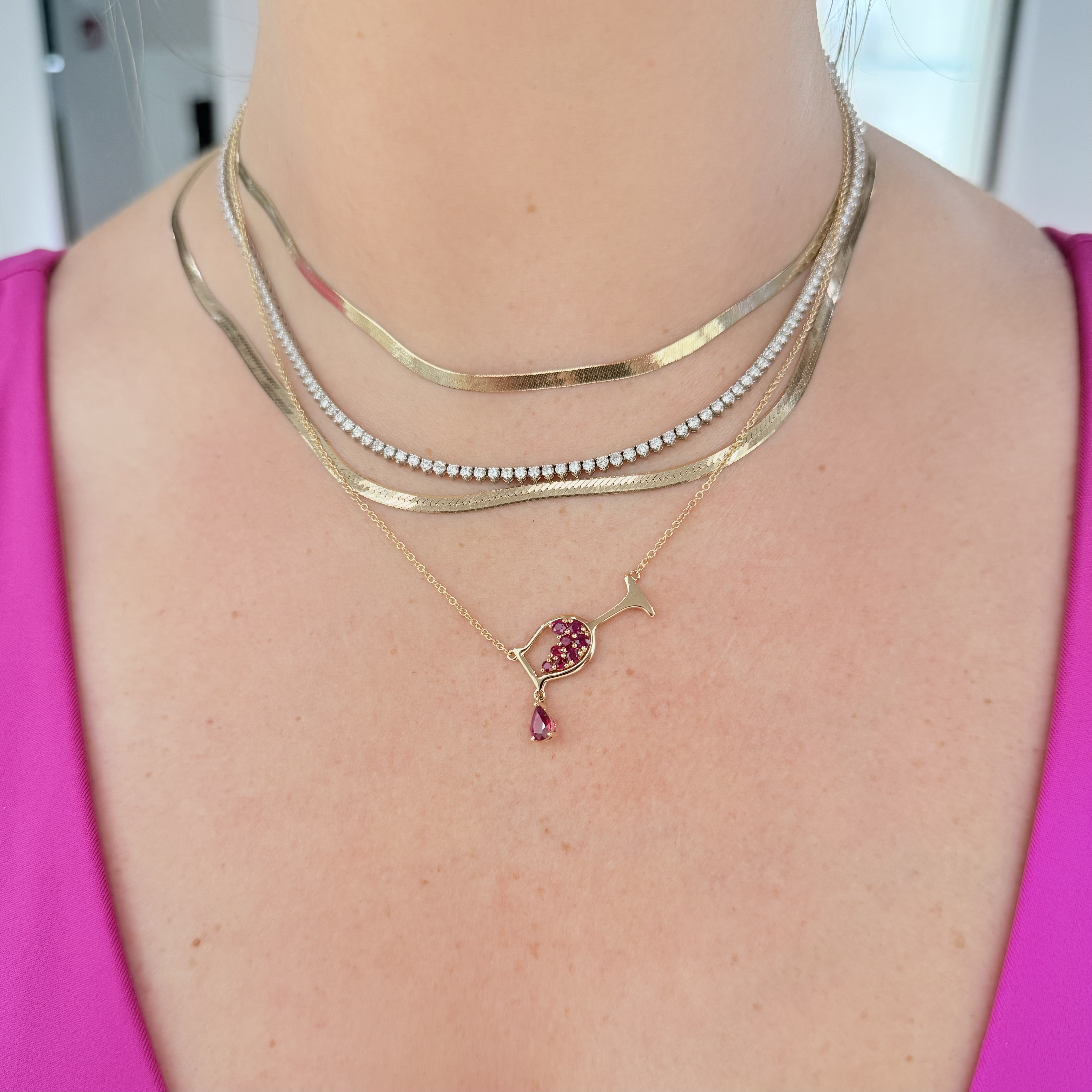 Cheers to one of our best-selling necklaces! This one features rubies for the red wine lover, spilling out of a tipped glass.