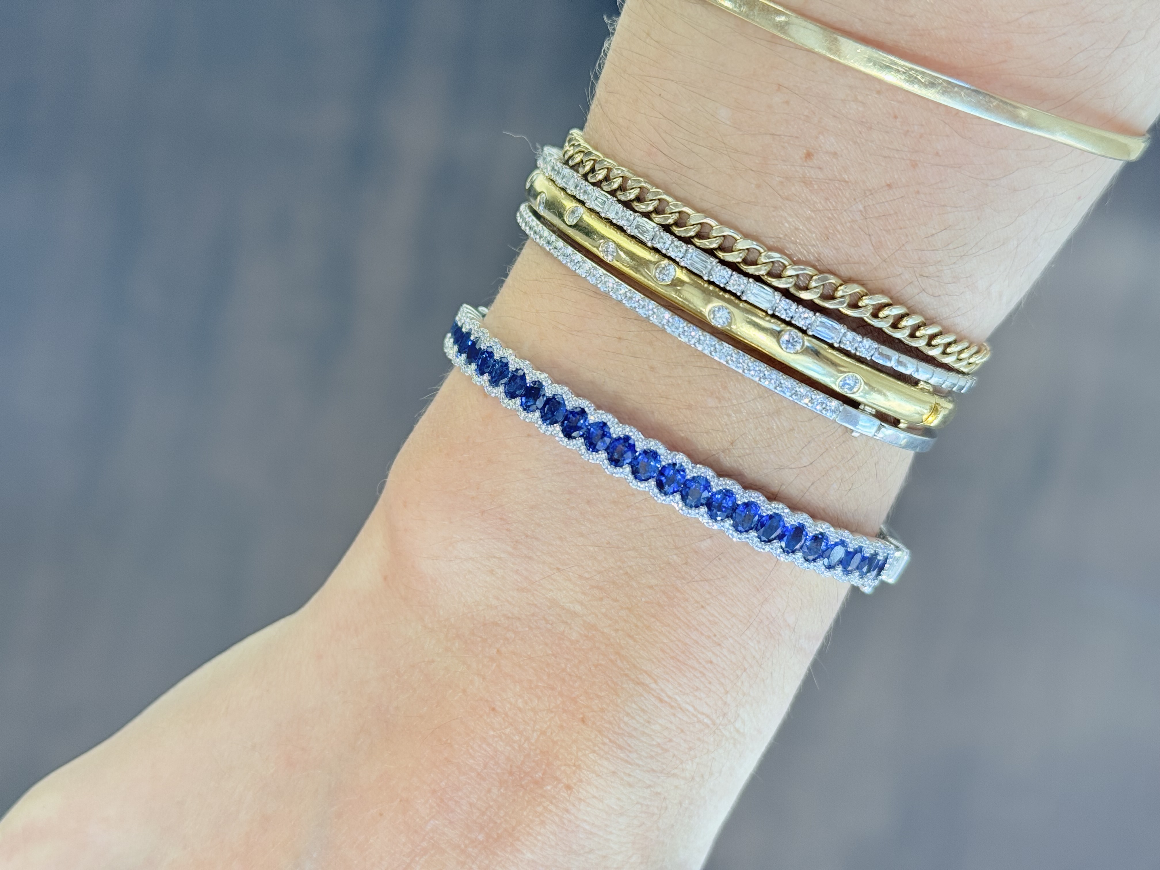 14KW GOLD BLUE SAPPHIRE & SEMI-DIAMOND HALO HINGED BANGLE BRACELET