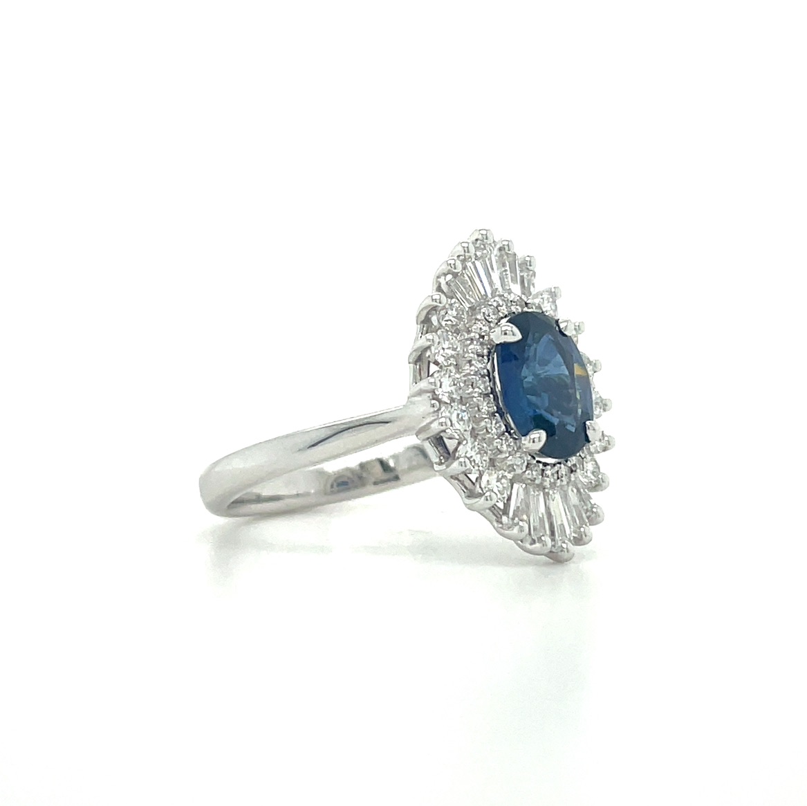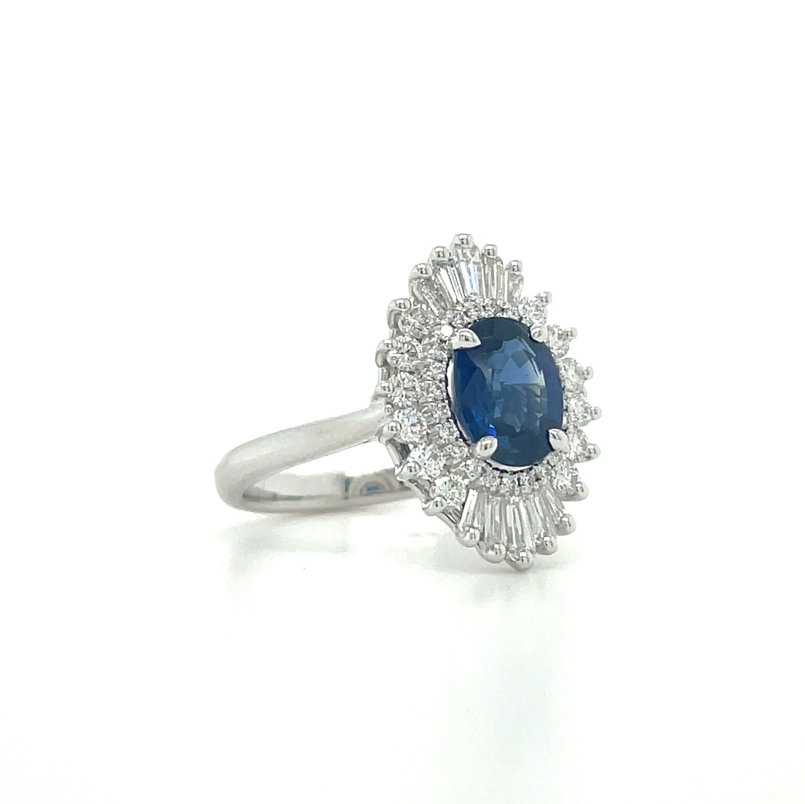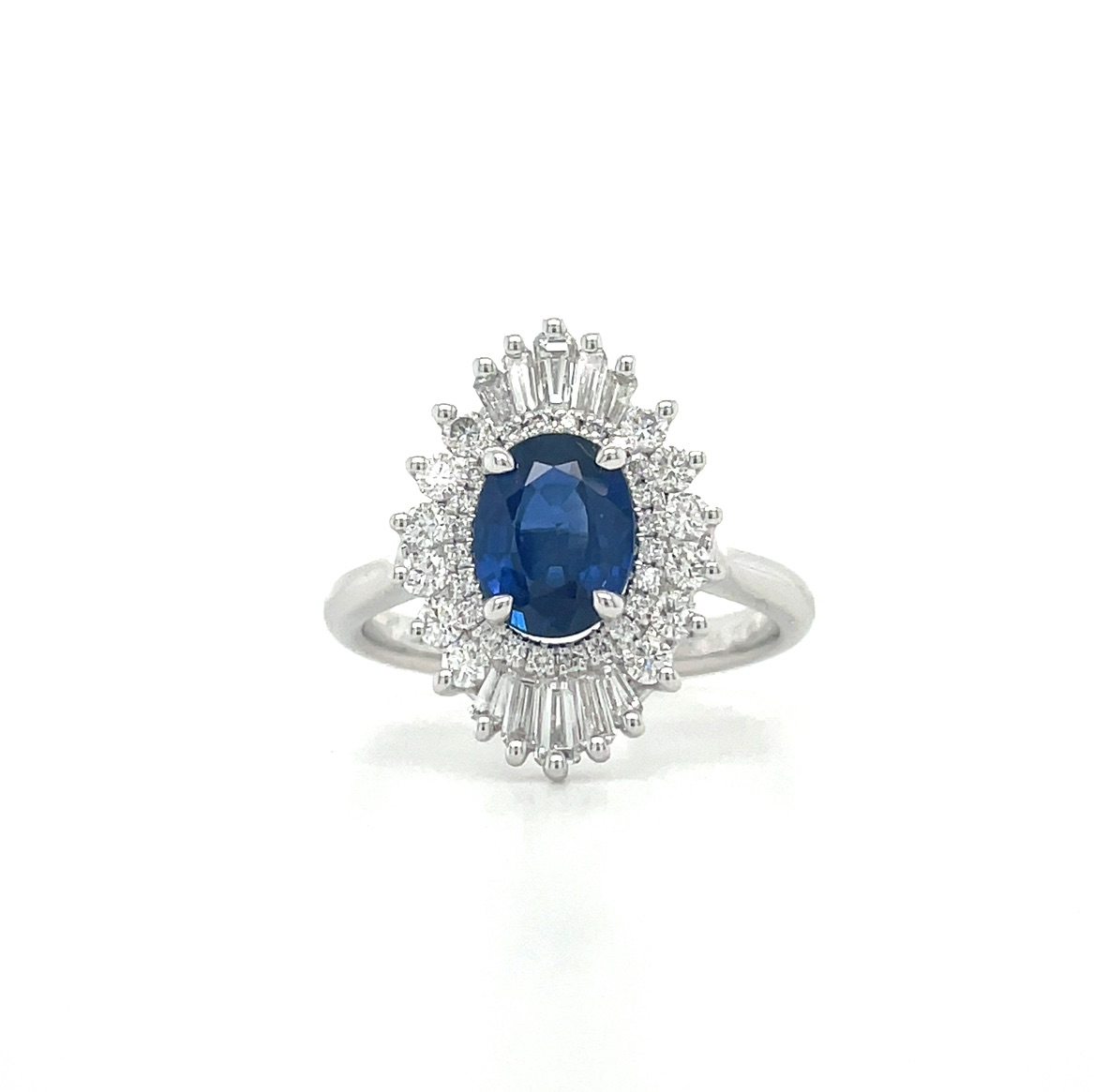 18KW GOLD 1.27CT OVAL BLUE SAPPHIRE ACCENTED WITH BAGUETTE AND ROUND BRILLIANT DIAMOND HALO RING BY SIMON G.®