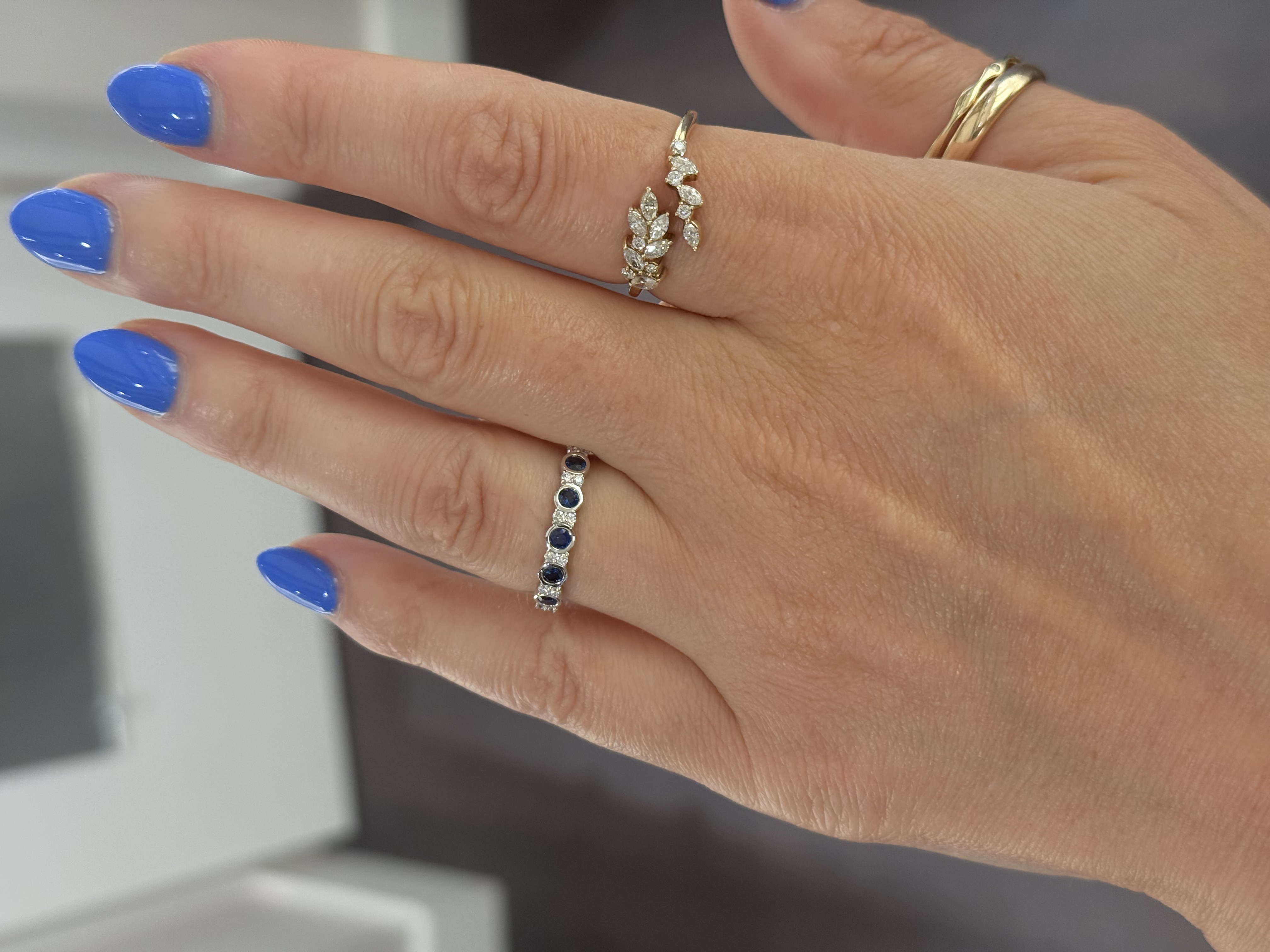 14KW GOLD ALTERNATING ROUND BEZEL-SET BLUE SAPPHIRE & PRONG SET DIAMOND RING
