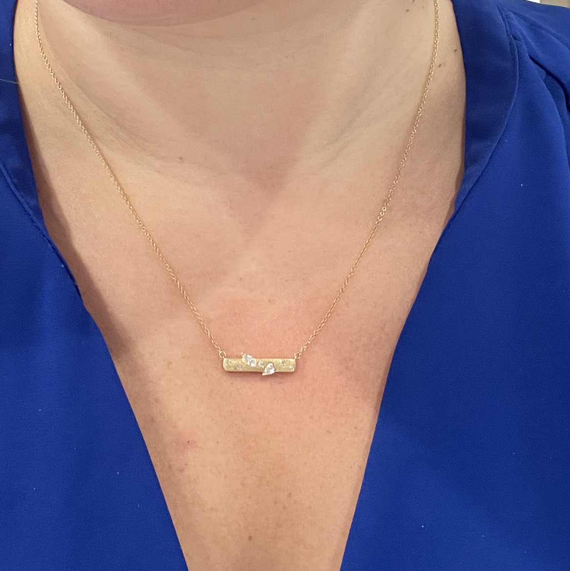 14KY GOLD SCATTERED PEAR, MARQUISE, AND ROUND DIAMOND "LEAF MOTIF" BAR PENDANT