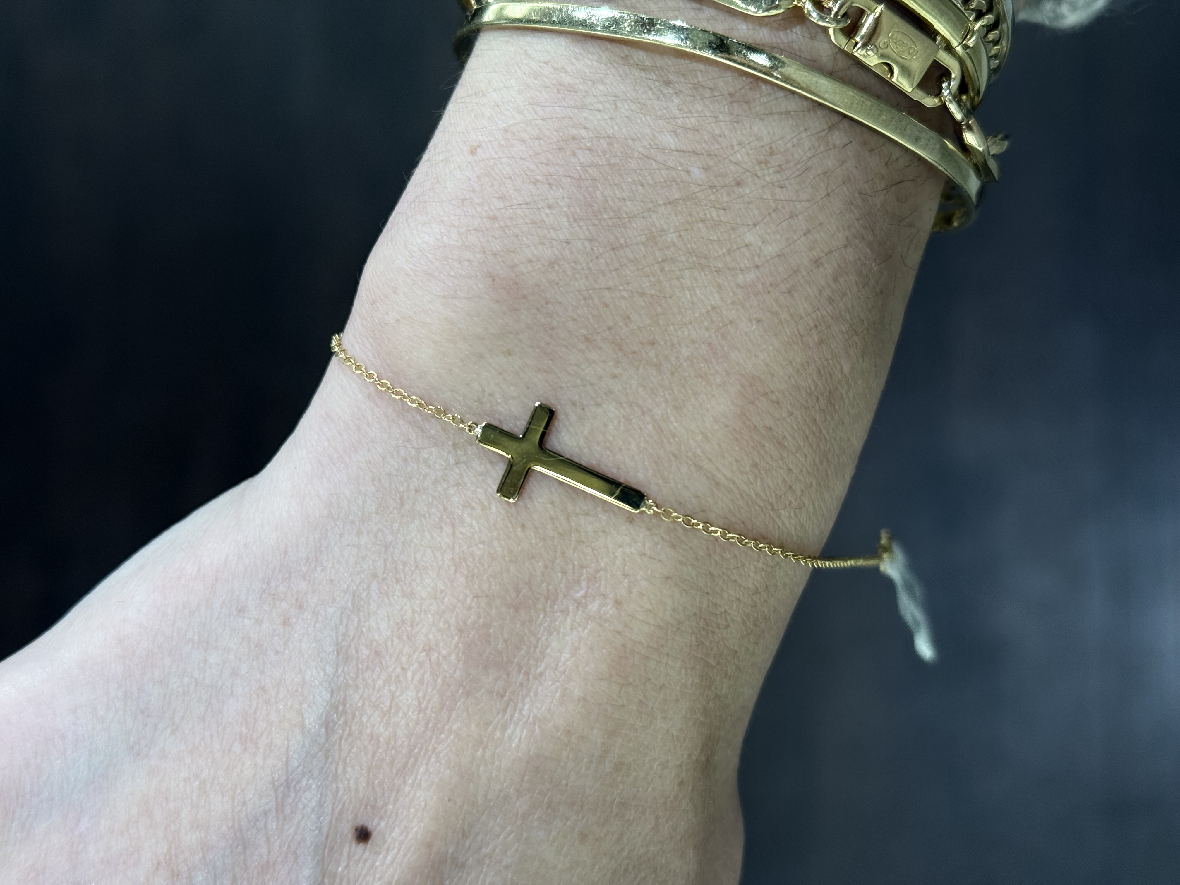 In the ancient world, the orientation of the cross from East to West held profound significance. It was believed to represent the path of the sun, symbolizing life, renewal, and the never-ending journey of the soul. This "East-to-West" cross bracelet captures that timeless essence, infusing it with the modern elegance of 14K yellow gold. Each glance at the bracelet serves as a reminder of the wearer's journey, resilience, and unwavering faith.