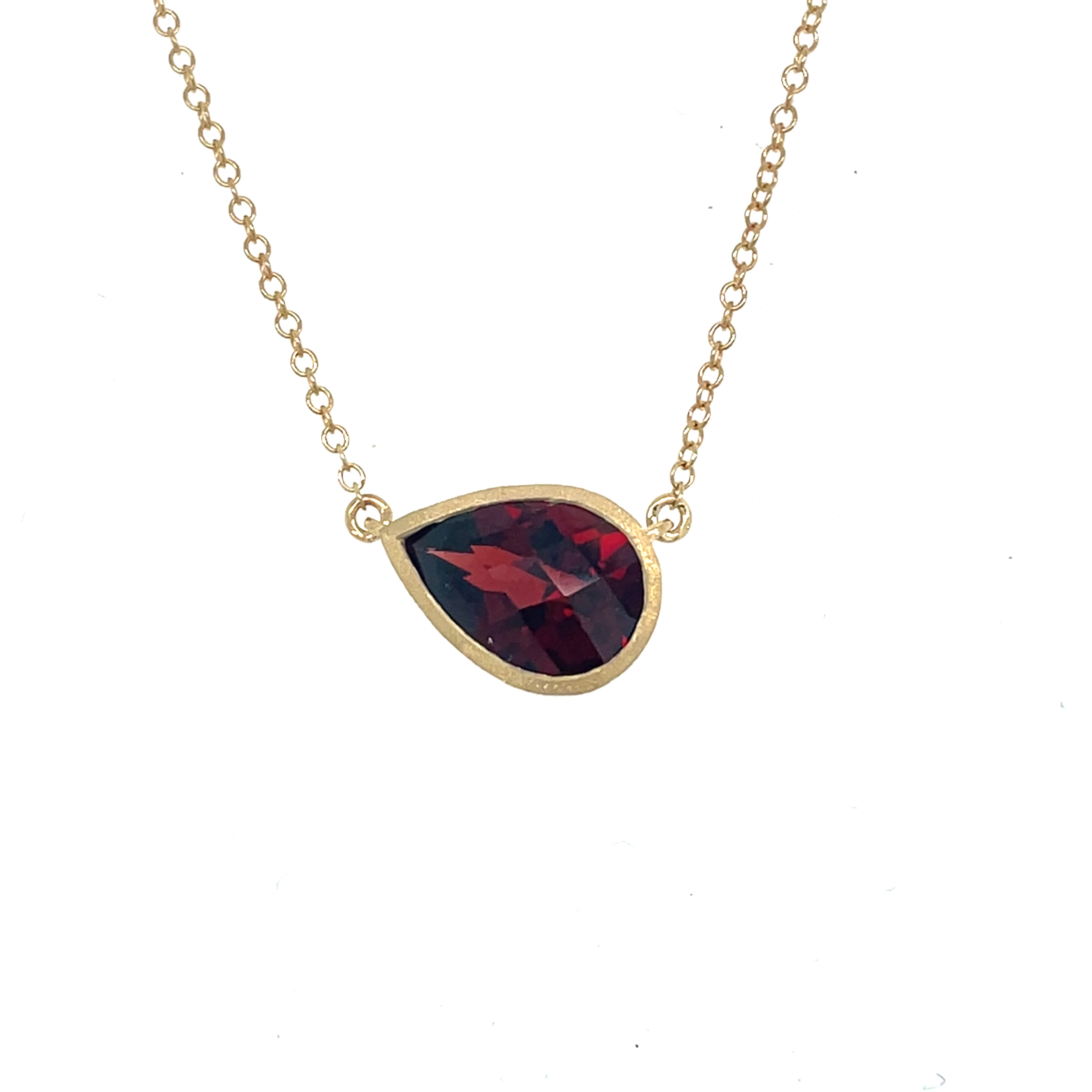 14KY GOLD BEZEL SET PEAR SHAPED RED GARNET PENDANT WITH SATIN FINISH