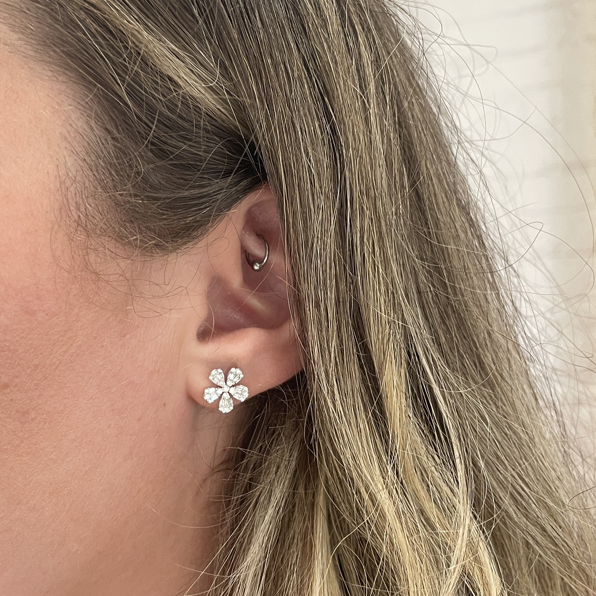14KW GOLD BAGUETTE AND ROUND BRILLIANT DIAMOND FLORAL STUDS .50CTTW
