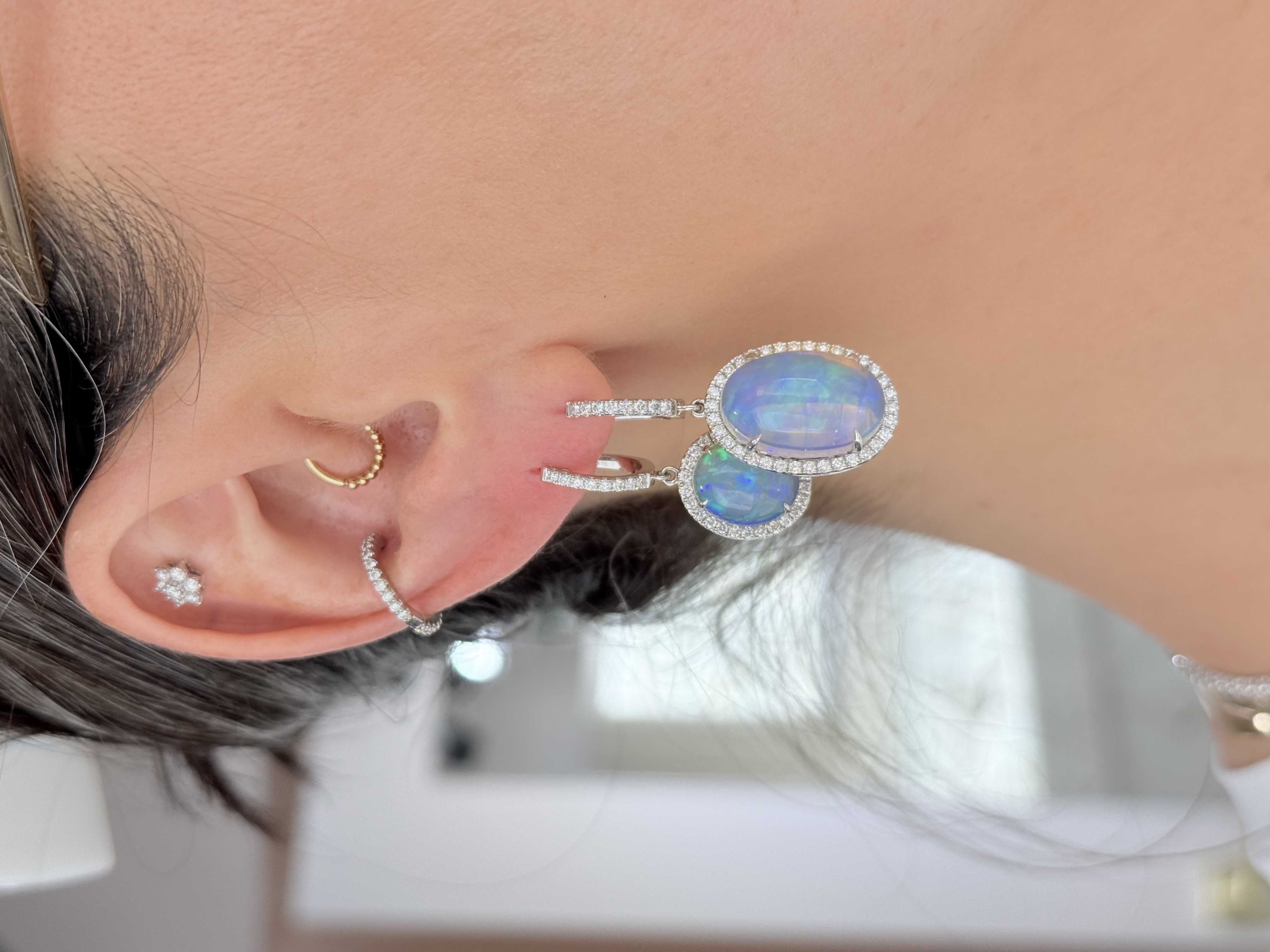 18KW GOLD 5.32CTTW OPAL DANGLE EARRINGS WITH .73CTTW DIAMOND HALO AND ACCENTS