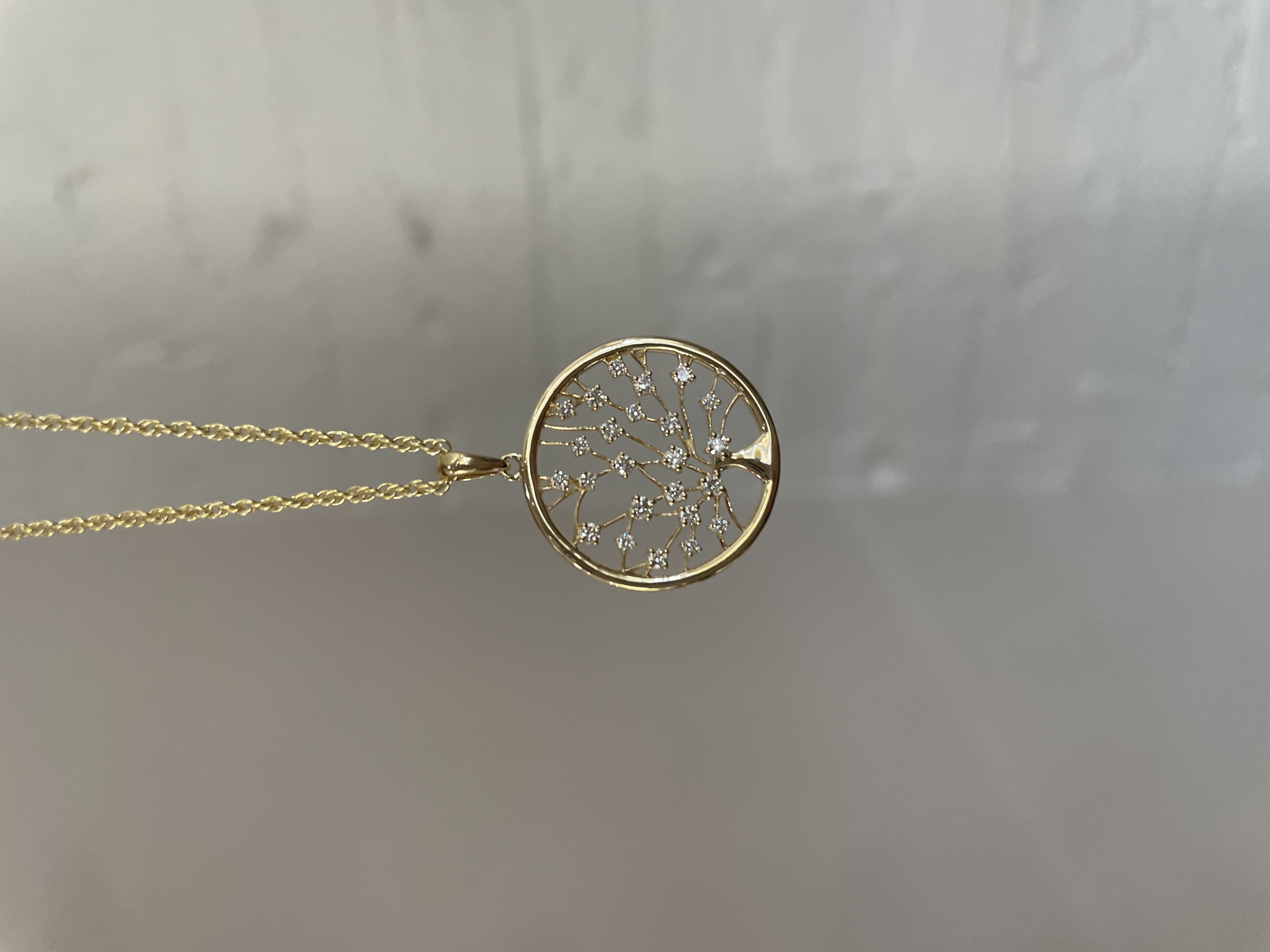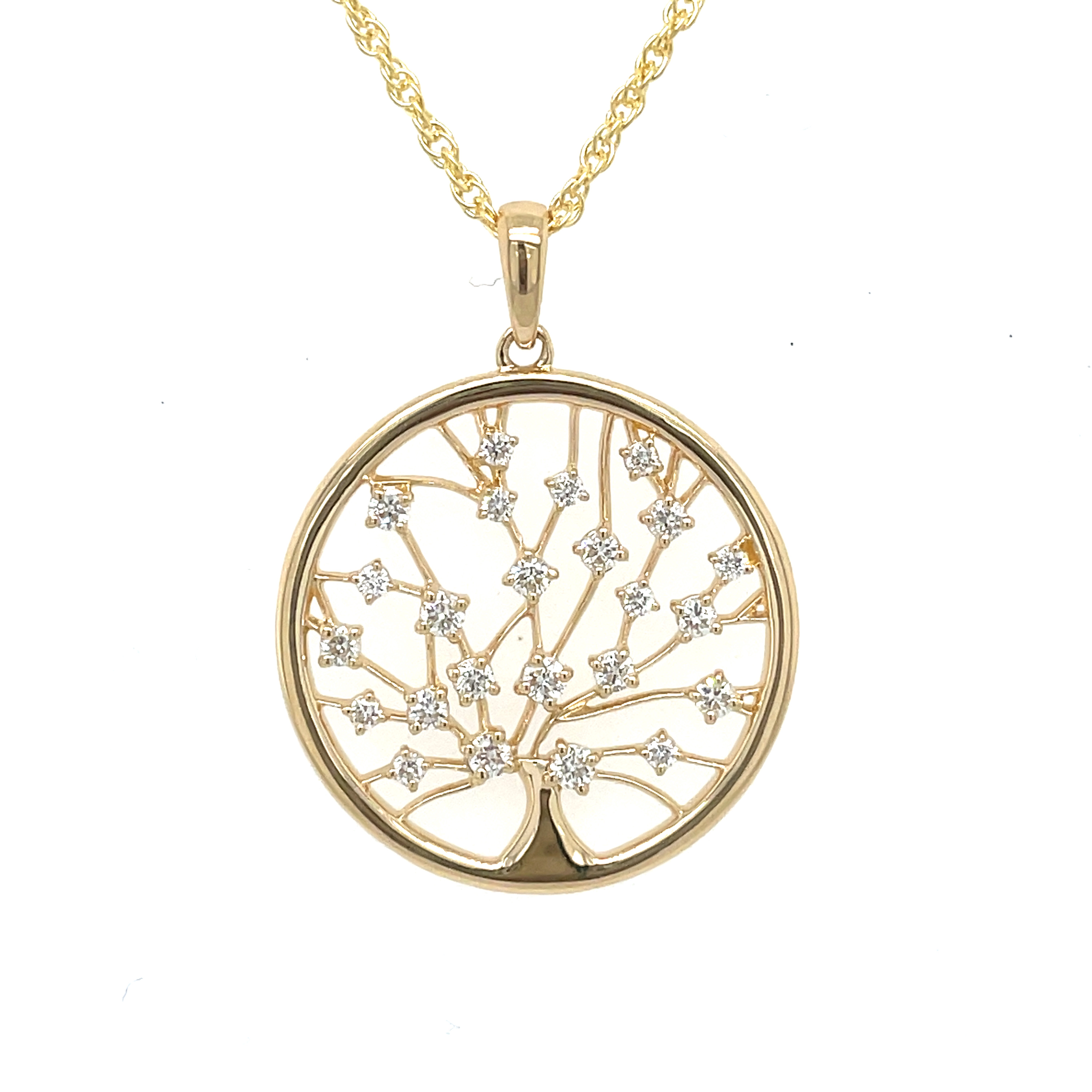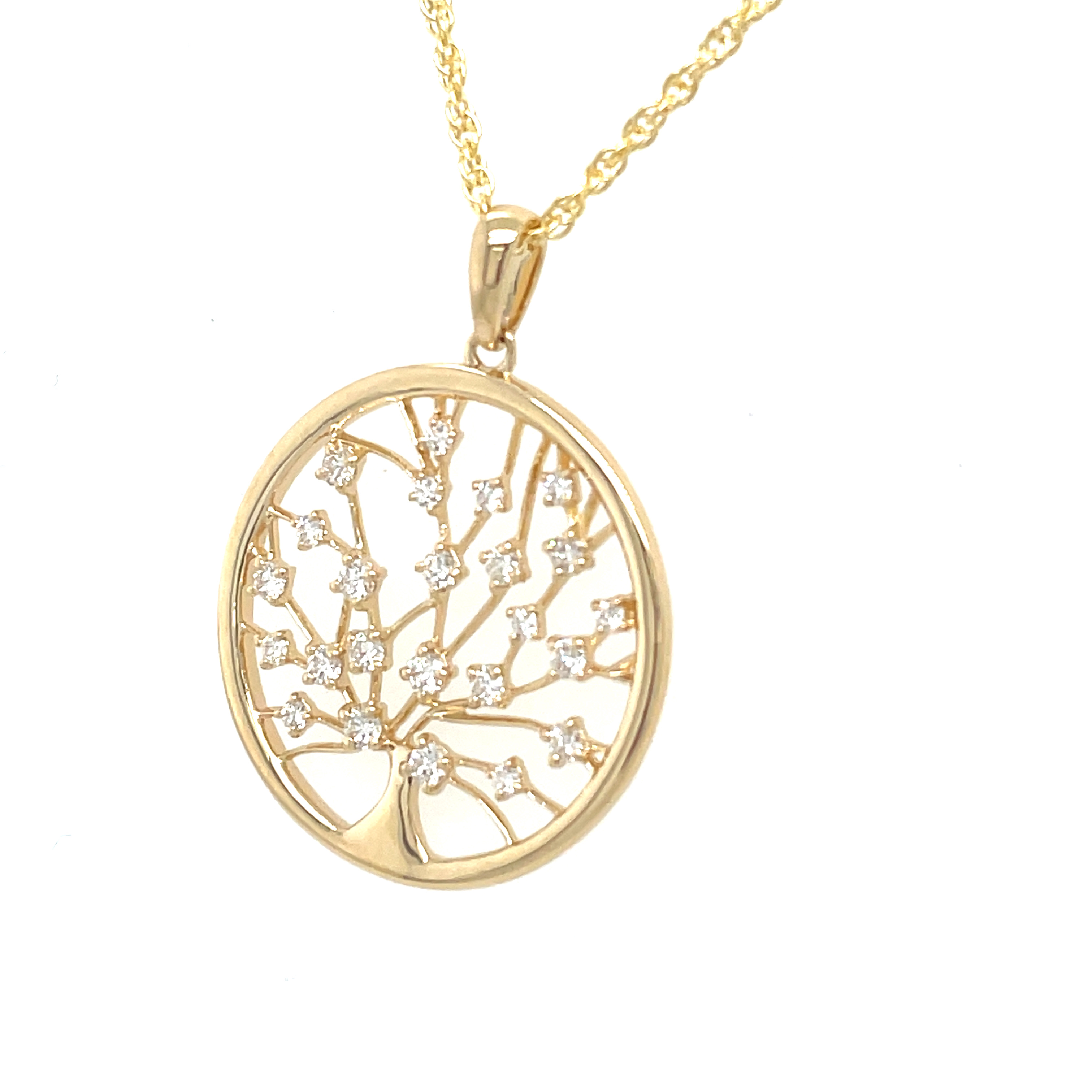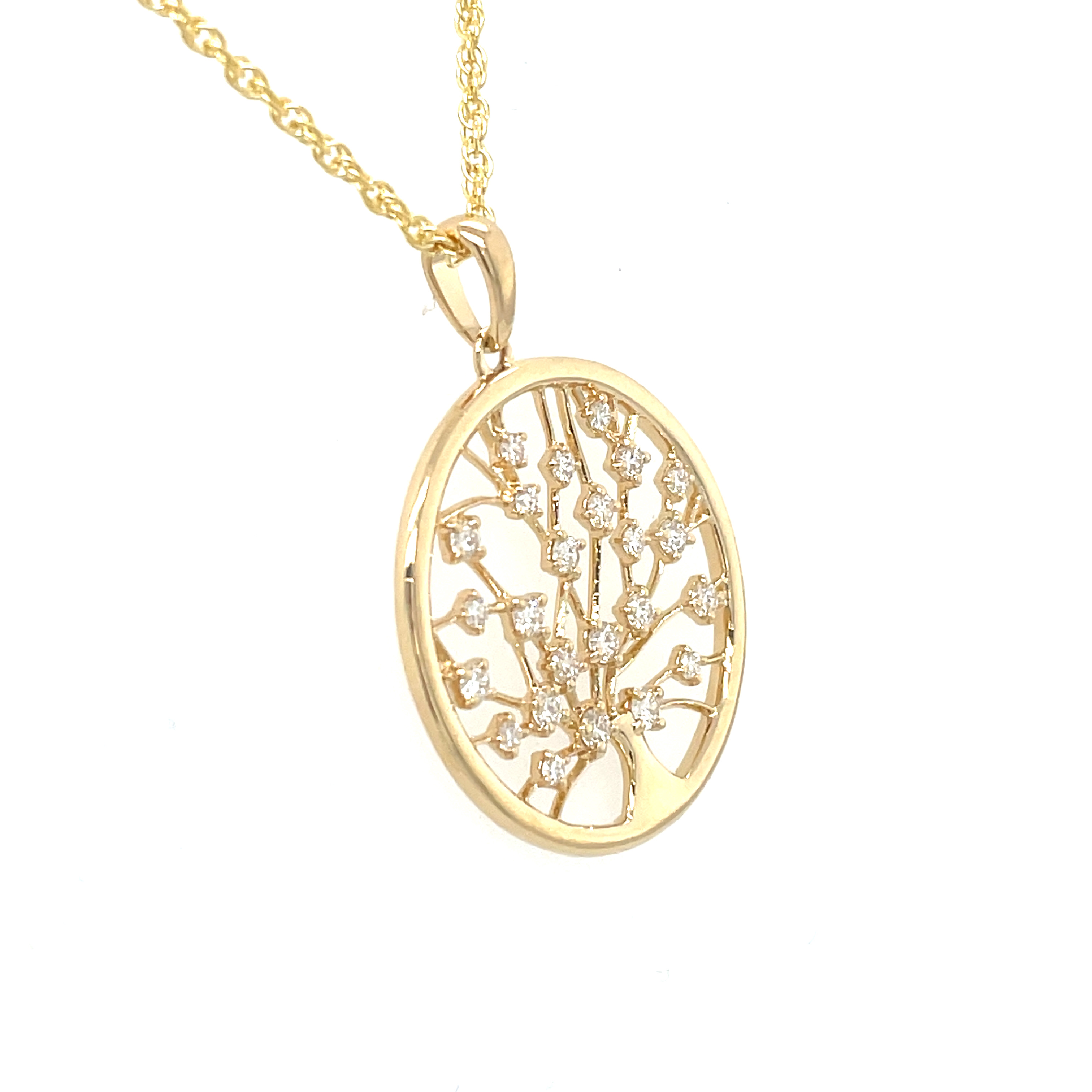 The pendant gracefully hangs from an 18-inch 14KT yellow gold rope chain, characterized by its intricate twisted design that adds texture and visual interest. The chain is equipped with a sturdy lobster clasp, ensuring a secure fit while maintaining ease of use. This "Tree of Life" diamond pendant is not just a piece of jewelry; it's a meaningful statement of elegance and enduring beauty, perfect for any occasion.
