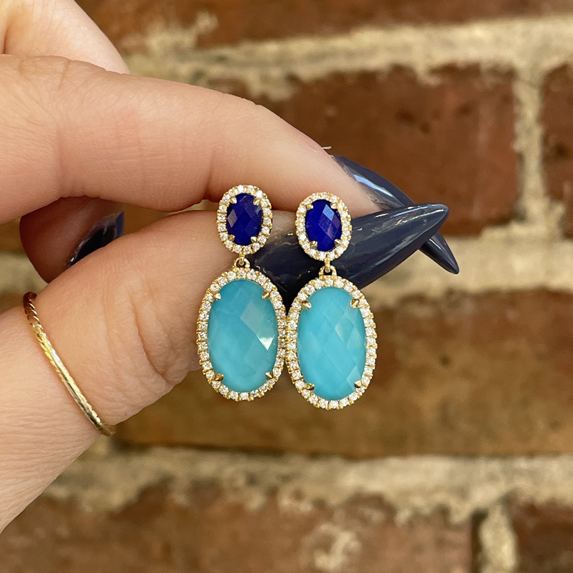 18ky gold "st. barths" diamond-accented dangle earrings featuring clear quartz over lapis top and clear quartz over turquoise bottom