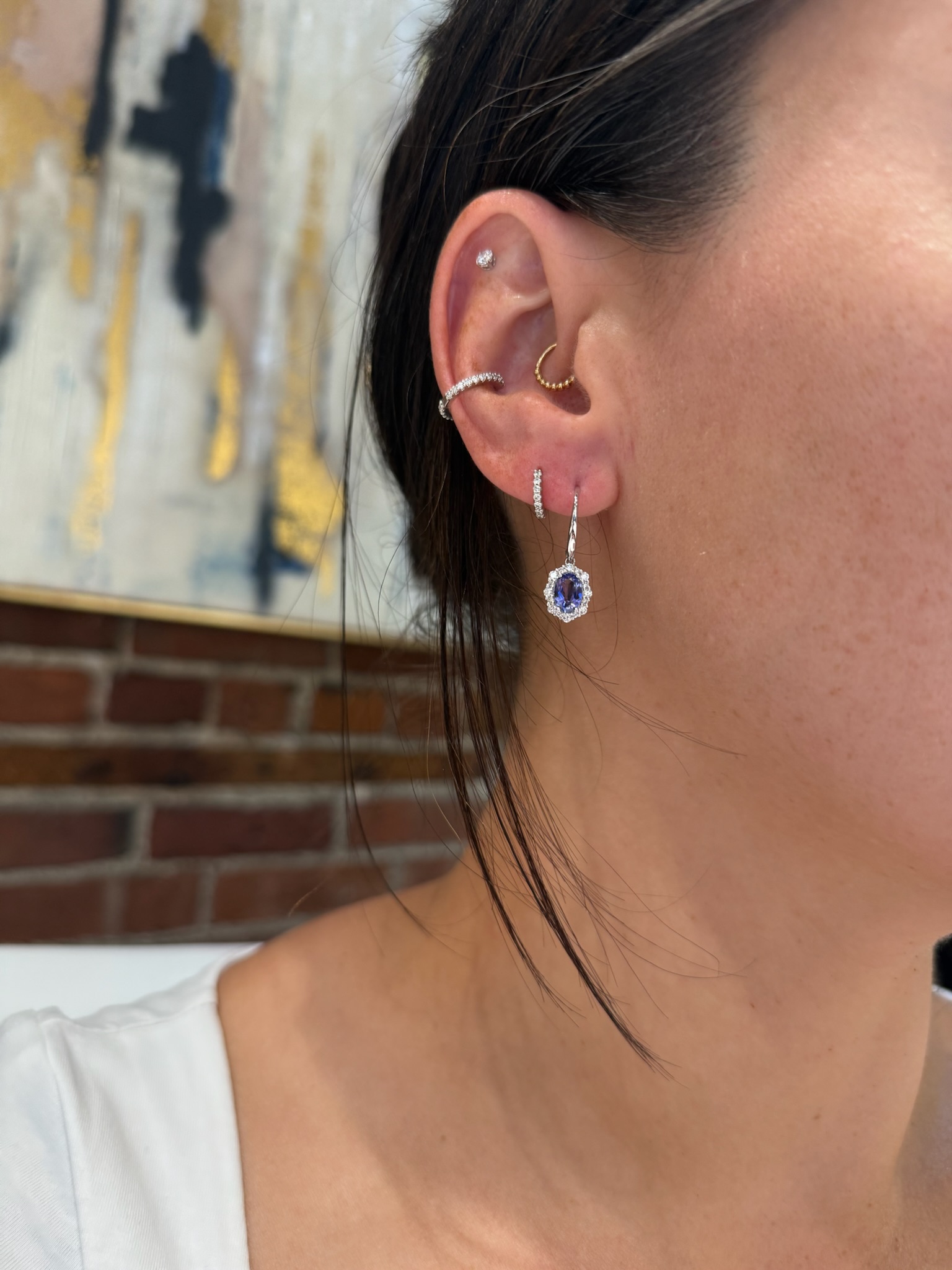 14KW GOLD TANZANITE & DIAMOND HALO DANGLE EARRINGS