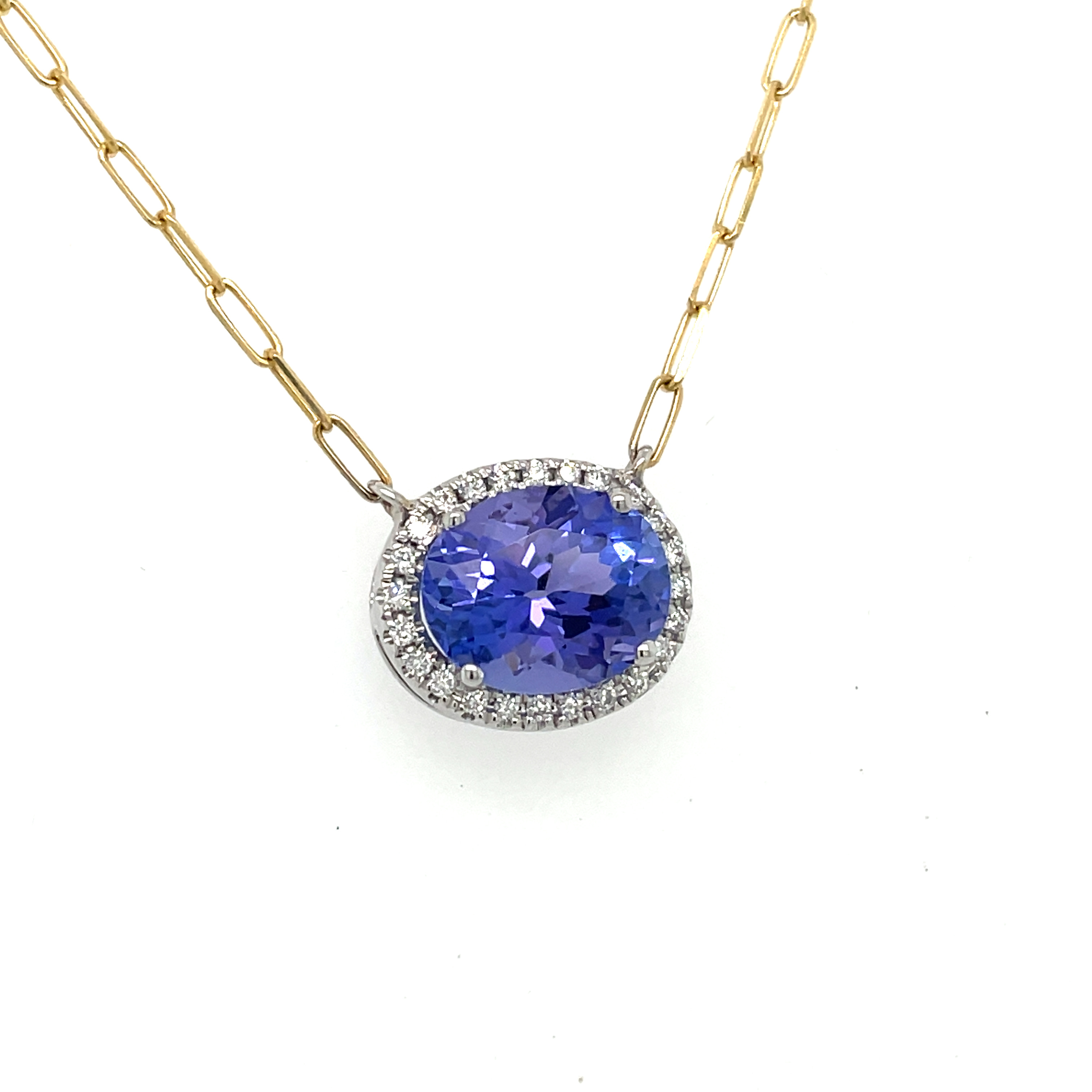 18KW&Y GOLD OVAL TANZANITE AND DIAMOND HALO PENDANT ON 18KY GOLD PAPERCLIP CHAIN
