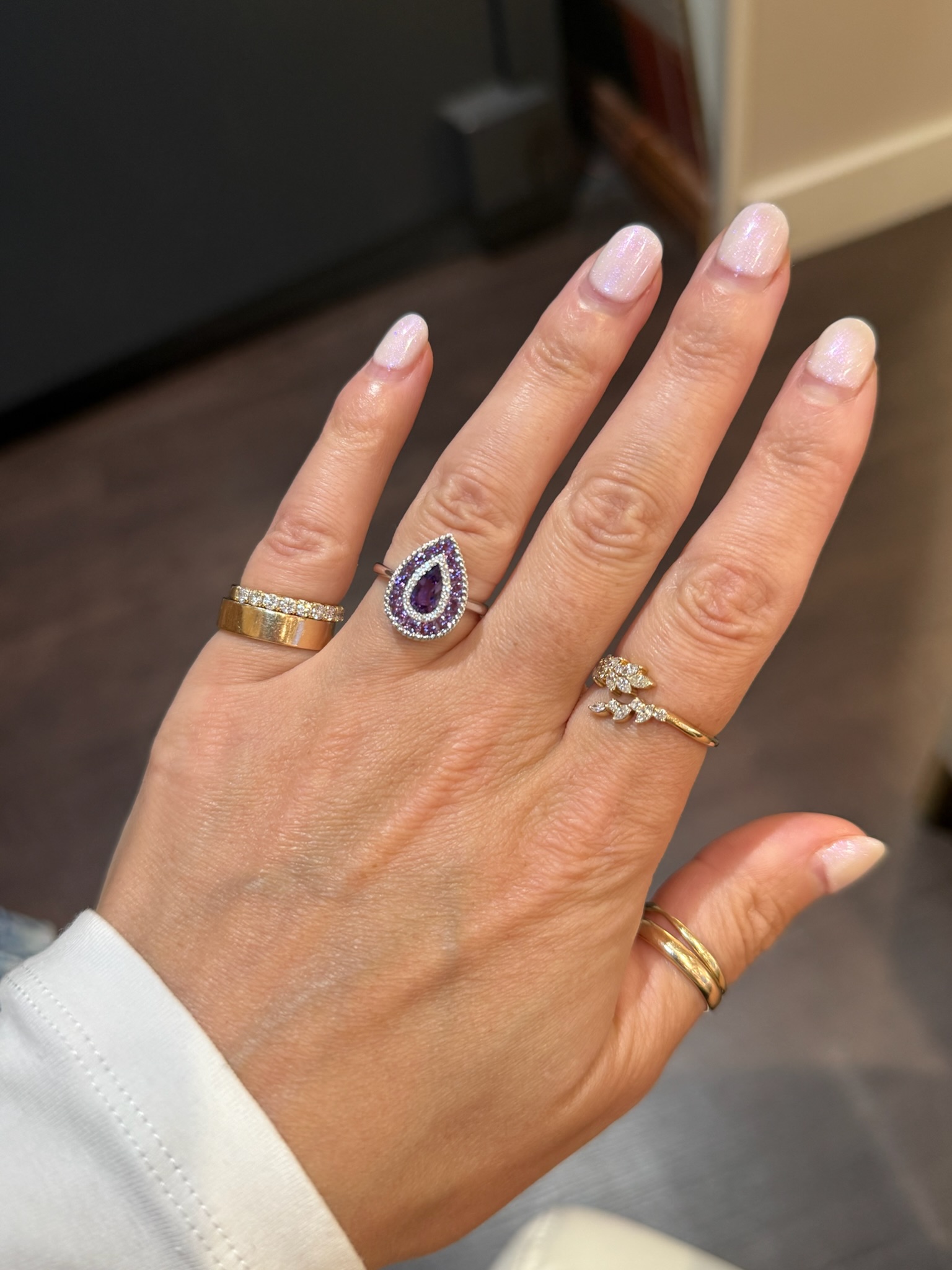 14KW GOLD 1.22TGW PEAR-SHAPED AMETHYST RING WITH DIAMOND HALOS AND ROPE DETAIL