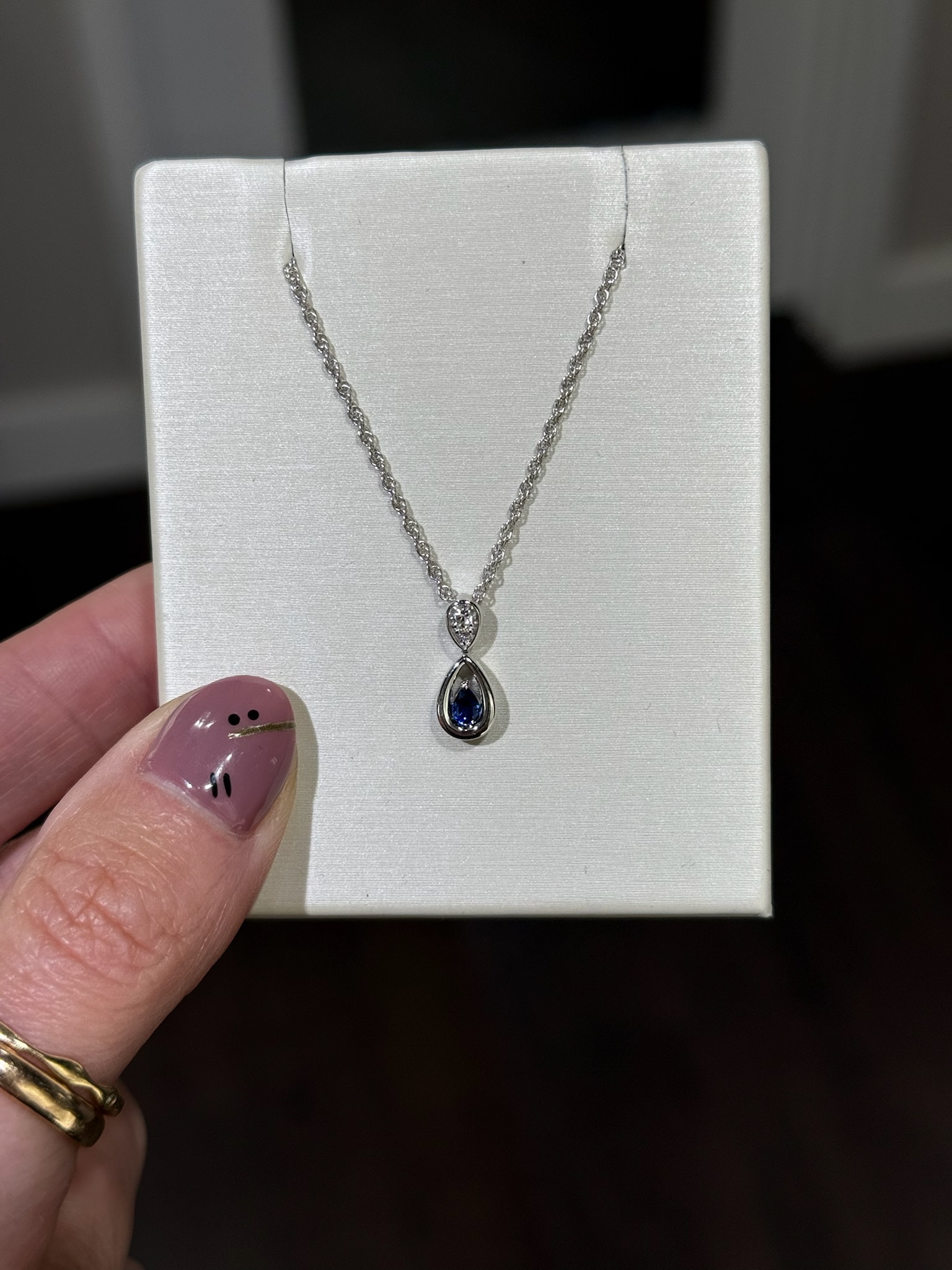 14KW GOLD TEAR-DROP STYLE PENDANT FEATURING OVAL BLUE SAPPHIRE & DIAMOND ACCENTED BAIL