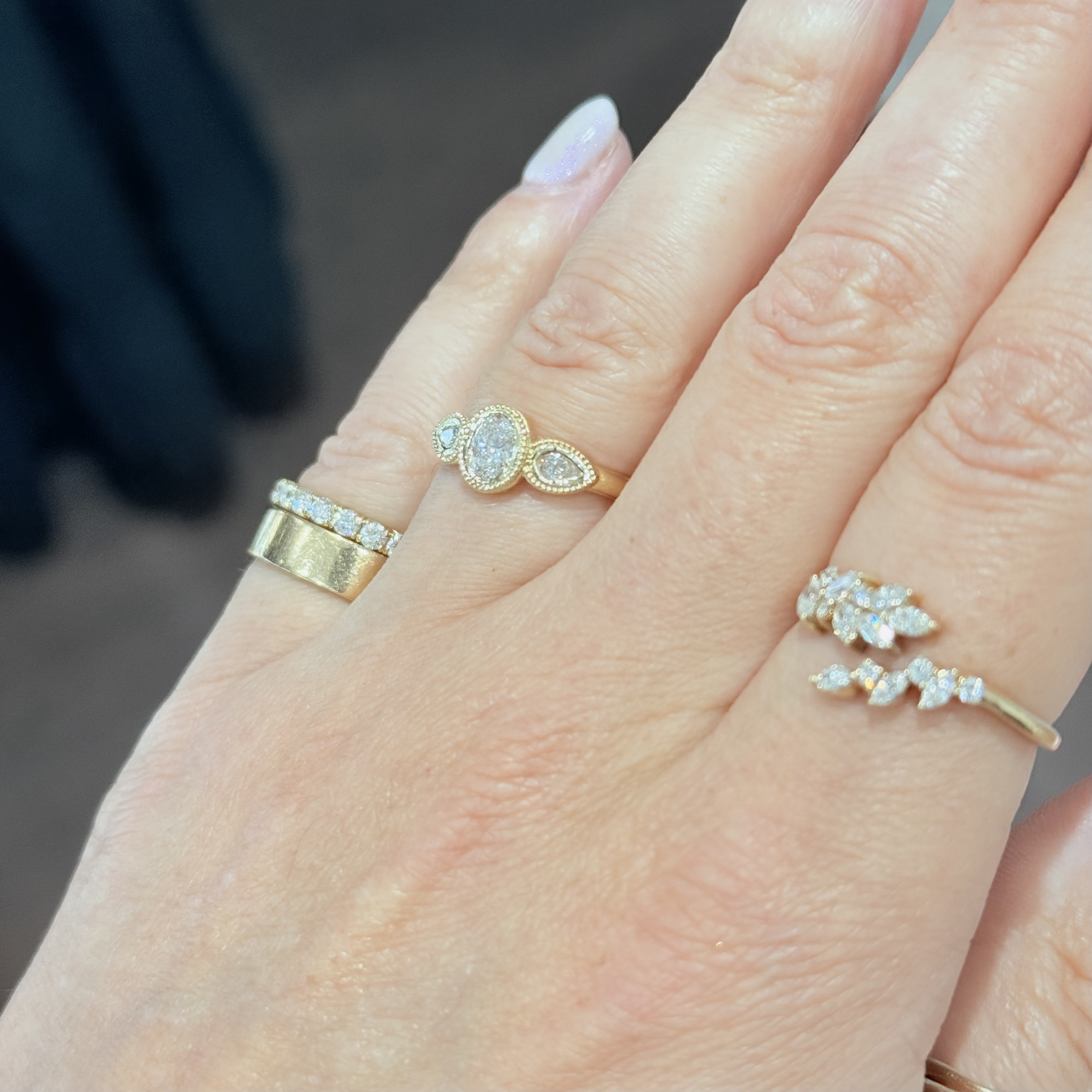 Description 14KY GOLD THREE-STONE BEZEL SET DIAMOND RING WITH MILGRAIN RIMS 14KT YELLOW GOLD- 585, HIGH POLISH/MILGRAIN3=.60CTTW OVAL & PEAR SHAPE DIAMONDS G COLOR, SI1 CLARITYDIAMONDS BEZEL SET WITH MILGRAIN RIMSFINGER SIZE 7