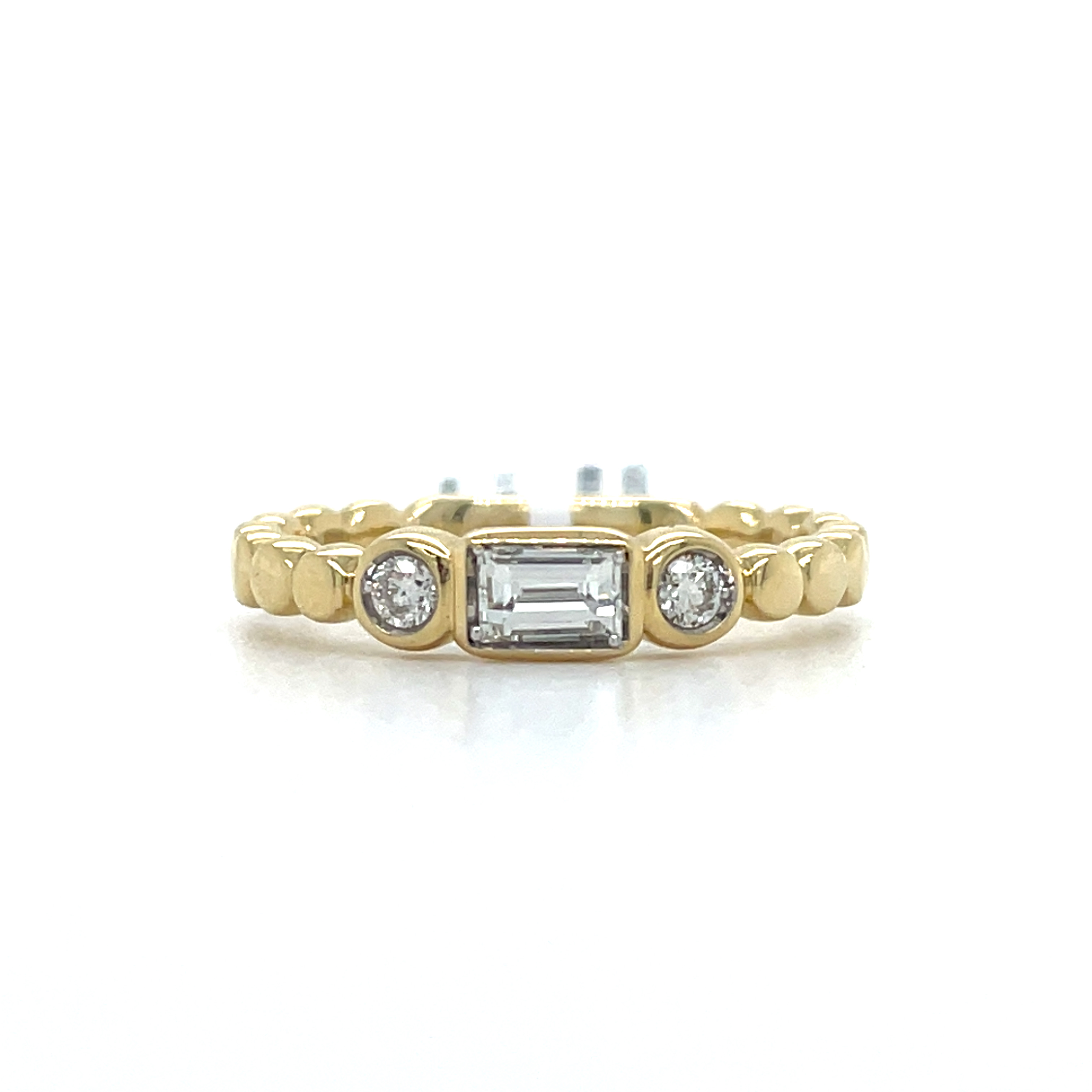 14KY GOLD BEZEL SET THREE-STONE DIAMOND RING WITH BEADED SHANK