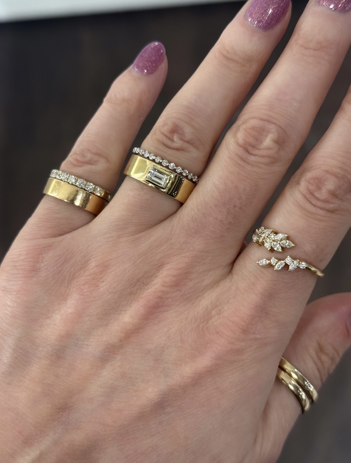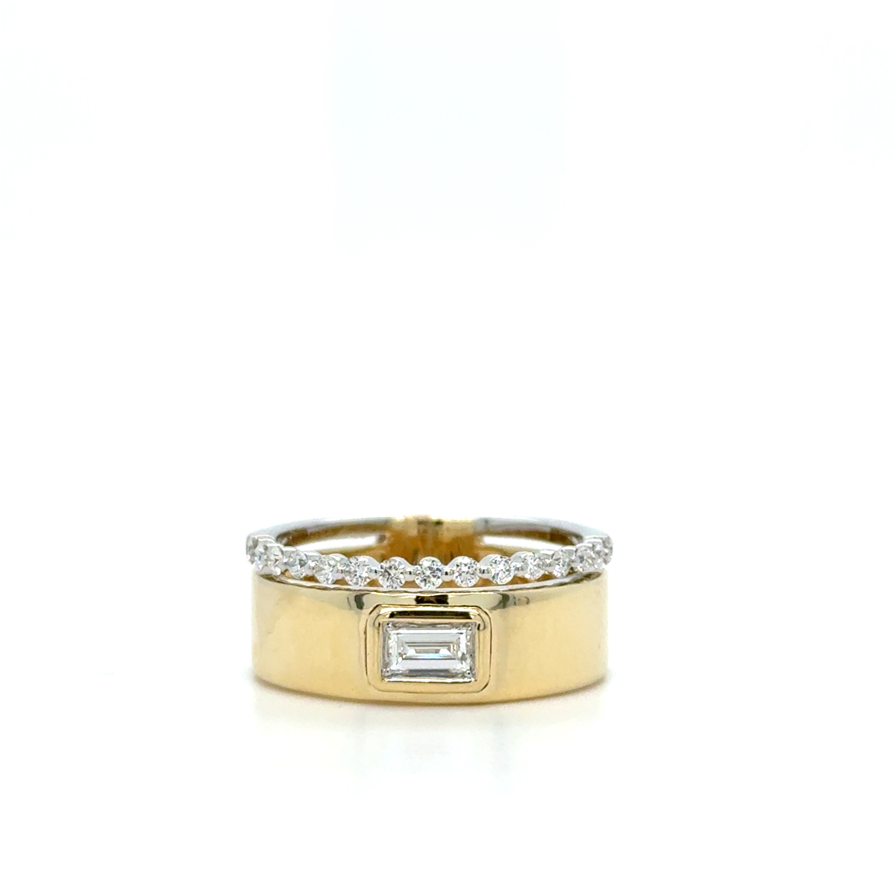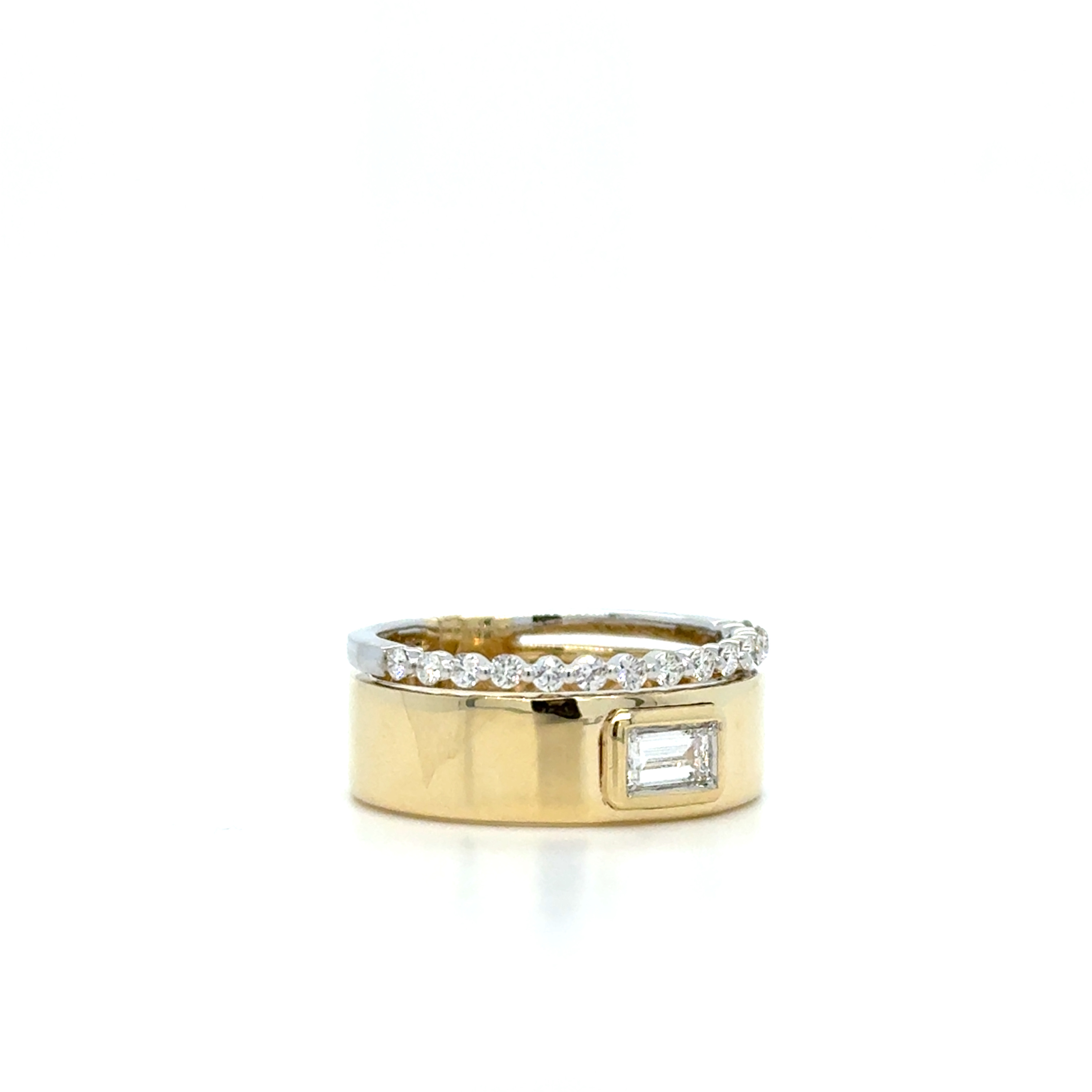 14KY&W GOLD TWO-ROW CHUNKY GOLD BAND FEATURING BEZEL SET BAGUETTE DIAMOND & DIAMOND BAND