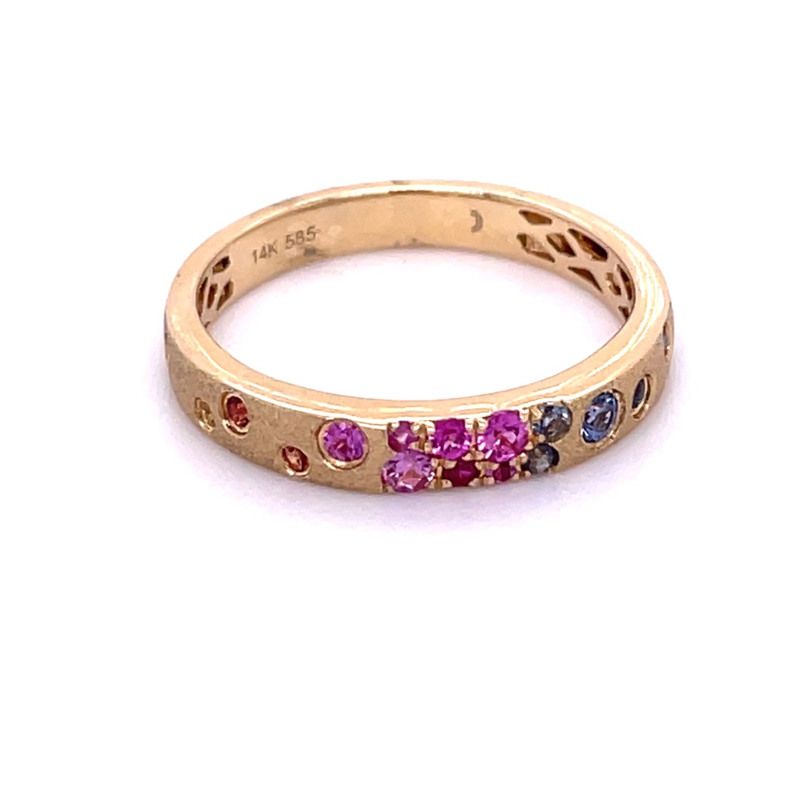 14ky gold thin rainbow confetti ring featuring multi-color sapphire and tsavorite garnet .30cttw