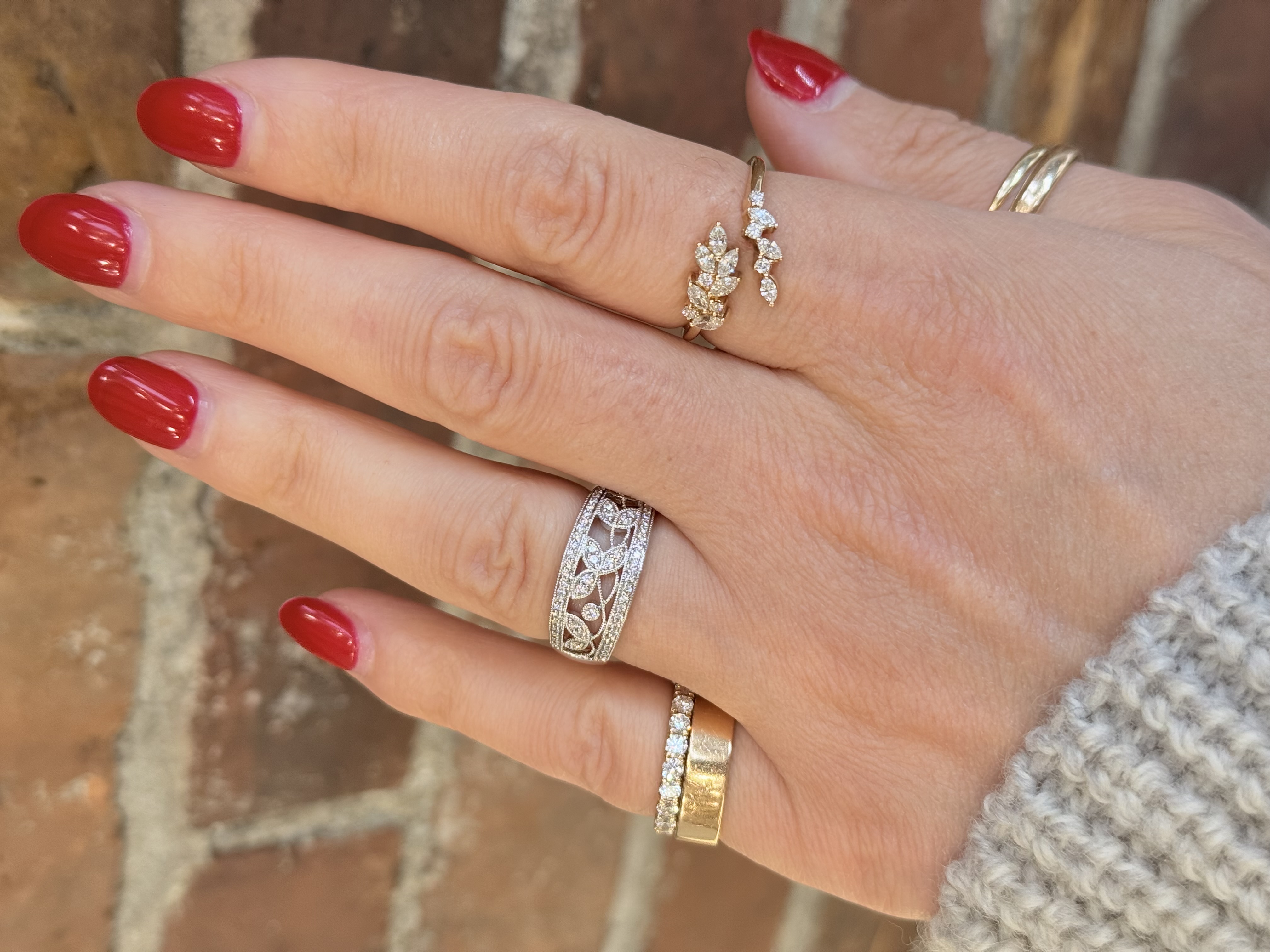 14KW GOLD OPEN VINE DESIGN DIAMOND BAND WITH BEADED DESIGN