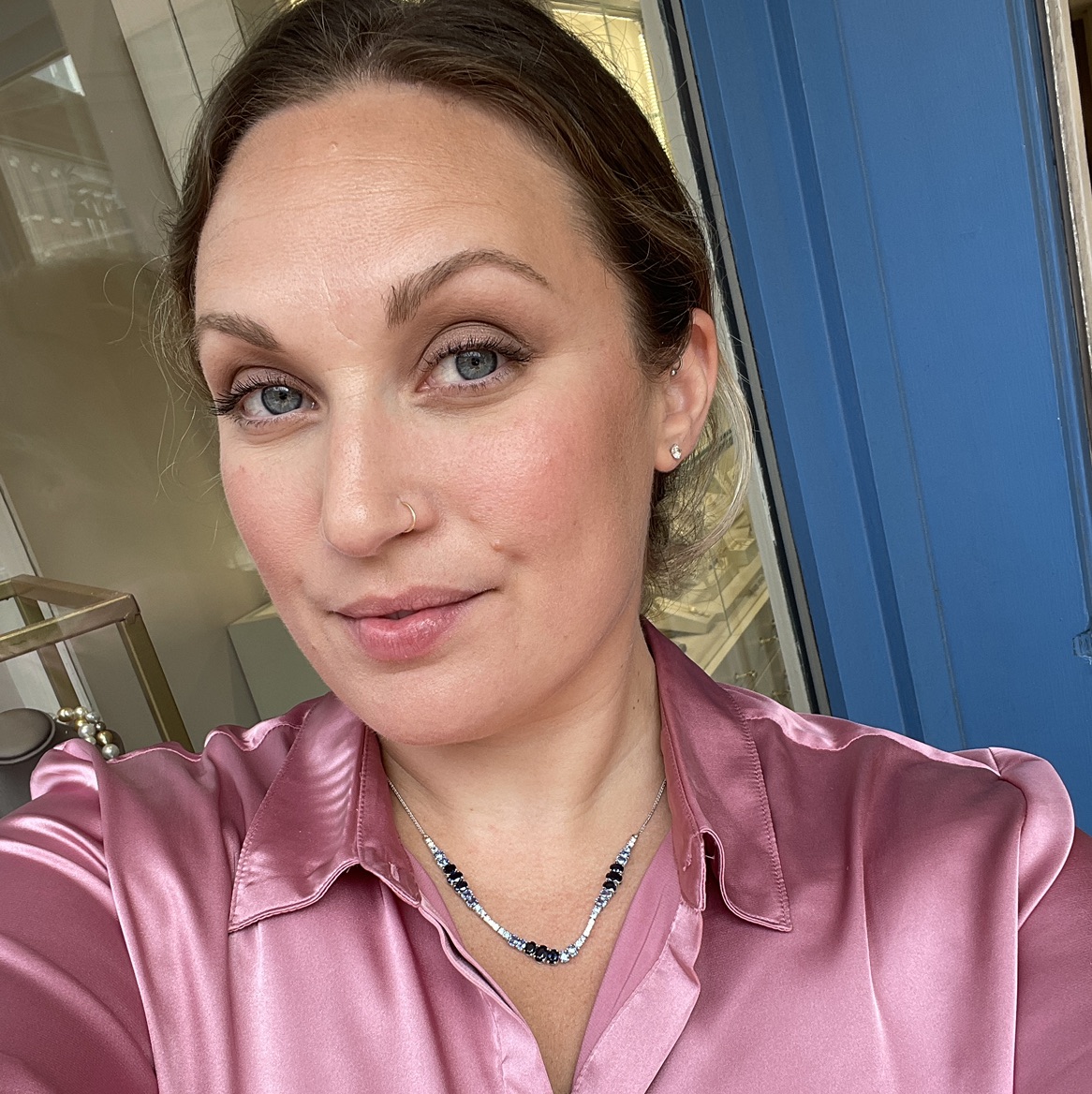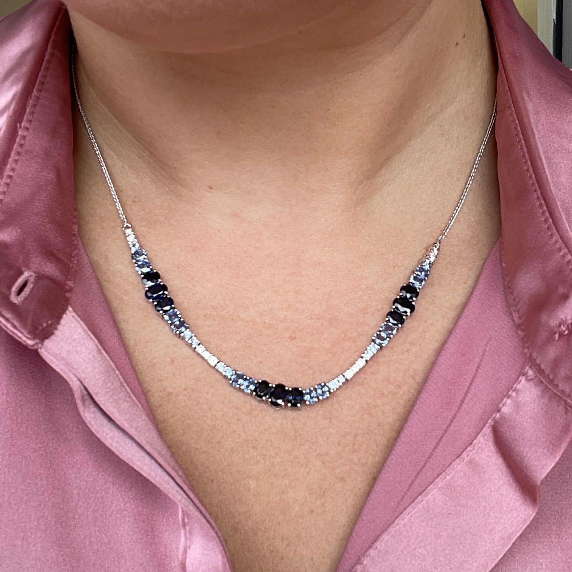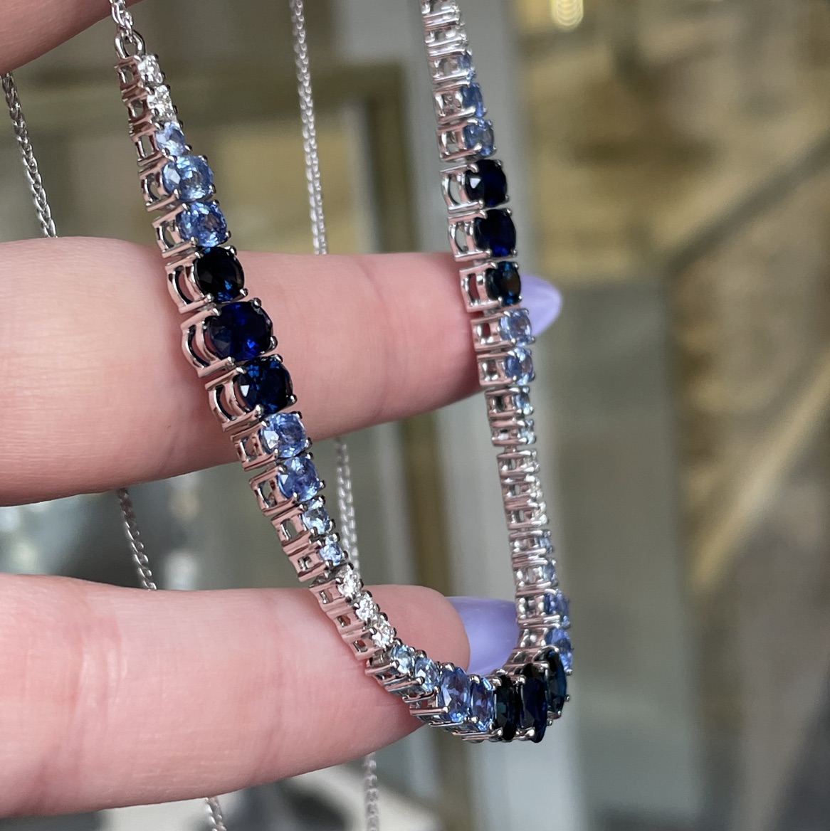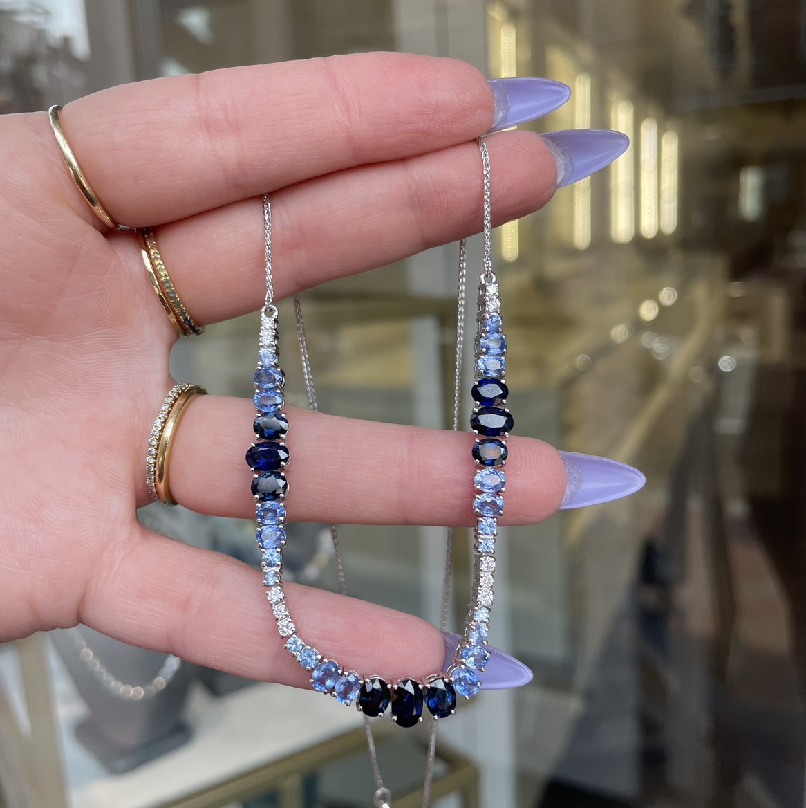 18" 14KW GOLD "PRINCESSA COLLECTION" BY BELLARI™ RIVIÈRE MULTISHADE BLUE SAPPHIRE AND DIAMOND NECKLACE